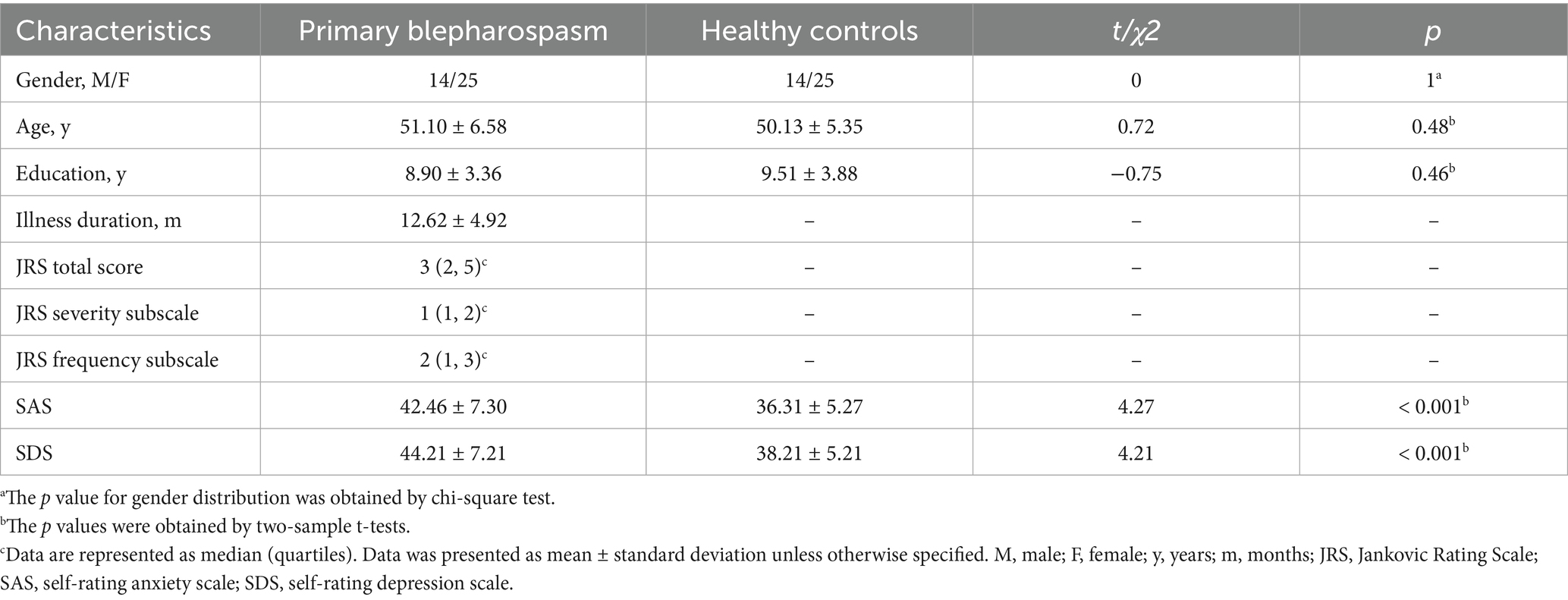 Between October 2023 and October 2024, we recruited 39 treatment-naive patients with BSP (Jankovic et al., 2009) and 39 healthy controls (HCs) matched for sex, age, and education level at the Sixth Affiliated Hospital of Nantong University. Inclusion criteria for BSP patients were: (1) meeting clinical diagnostic criteria for primary BSP; (2) having no contraindications to MRI and the ability to tolerate the scanning procedure with good cooperation; (3) being treatment-naive, with no prior history of BoNT injections or systemic medications specifically for BSP. Exclusion criteria for all participants included: history or current diagnosis of other neurological disorders, major psychiatric illness (past or present), significant ophthalmological conditions that could potentially confound symptoms, history of alcohol or drug abuse, a family history of movement disorders, and the presence of structural brain lesions identified on conventional MRI sequences. HCs were required to be in good general health with no history of neurological or psychiatric disorders. The study protocol adhered to the principles of the Declaration of Helsinki and was approved by the Ethics Committee of the Affiliated Hospital 6 of Nantong University (approval no: 201823). Written informed consent was obtained from all participants prior to enrollment.