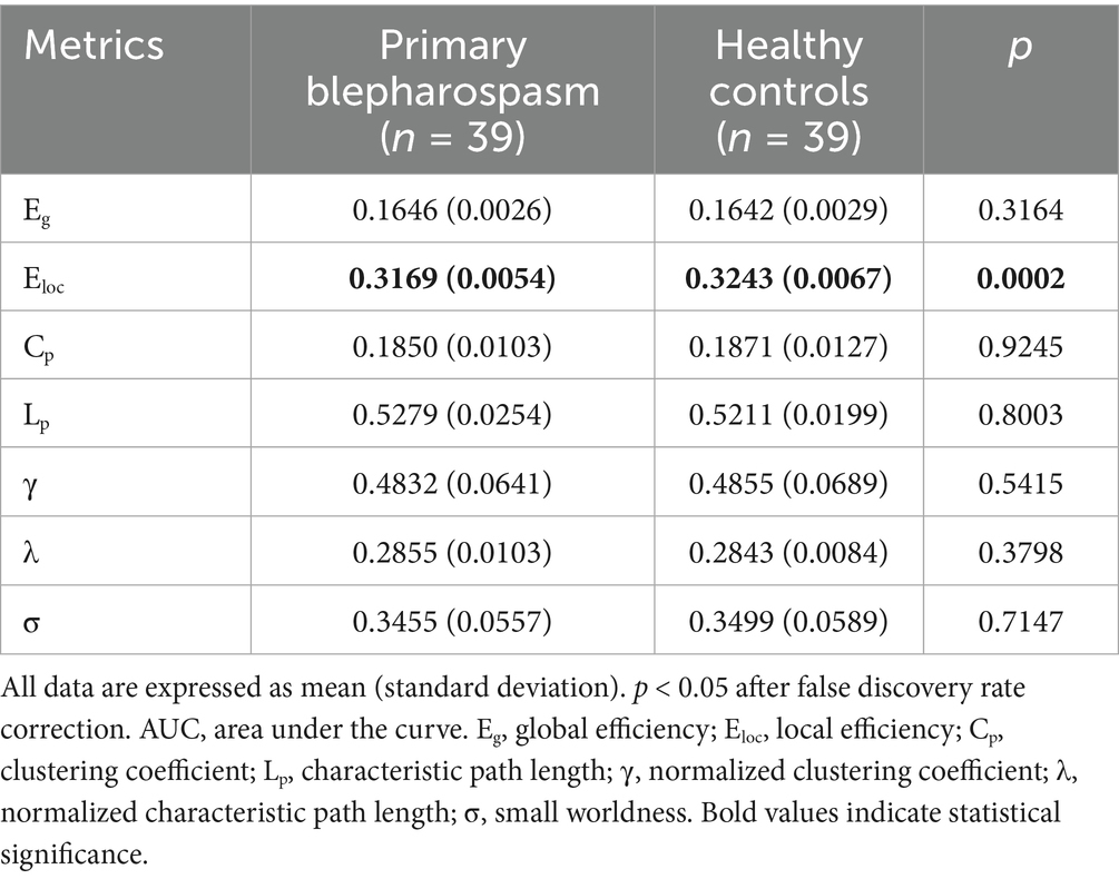 Figure 1. Group differences in global metrics. No significant group differences between patients with primary blepharospasm and healthy controls were found in global efficiency (Eg), characteristic path length (Lp), clustering coefficient (Cp), normalized clustering coefficient (γ), normalized characteristic path length (λ), or small-worldness (σ) (all p > 0.05, false discovery rate corrected). However, local efficiency (Eloc) was significantly lower in the primary blepharospasm group compared to healthy controls (*p < 0.05 after false discovery rate correction). AUC, area under the curve.