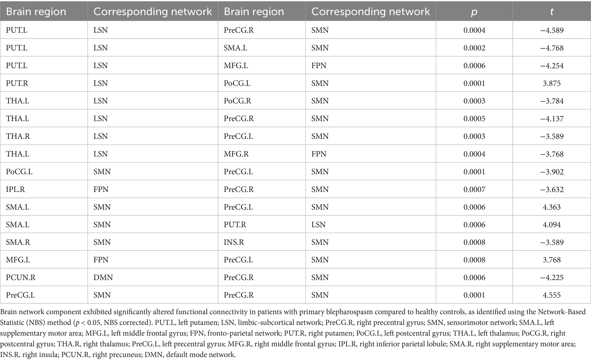 NBS analysis identified significant brain network components exhibiting altered FC between BSP patients and HCs (p < 0.05, NBS corrected). The networks primarily involved regions within and between the SMN, limbic-subcortical network (LSN), frontoparietal network (FPN), and DMN. Specifically, compared to HCs (Table 4; Figure 3), BSP patients showed significantly increased FC between: the left precentral gyrus and the right precentral gyrus (t = 4.555), the left supplementary motor area and the left precentral gyrus (t = 4.363), the left supplementary motor area and the right putamen (t = 4.094), the right putamen and the left postcentral gyrus (t = 3.875), and the left middle frontal gyrus and the left precentral gyrus (t = 3.768). Conversely, BSP patients demonstrated significantly decreased FC between: the left putamen and the right precentral gyrus (t = −4.589), the left putamen and the left supplementary motor area (t = −4.768), the left putamen and the left middle frontal gyrus (t = −4.254), the left thalamus and the right postcentral gyrus (t = −3.784), the left thalamus and the right precentral gyrus (t = −4.137), the left thalamus and the right middle frontal gyrus (t = −3.768), the right thalamus and the left precentral gyrus (t = −3.589), the left postcentral gyrus and the left precentral gyrus (t = −3.902), the right inferior parietal lobule and the right precentral gyrus (t = −3.632), the right supplementary motor area and the right insula (t = −3.589), and the right precuneus and the right precentral gyrus (t = −4.225).