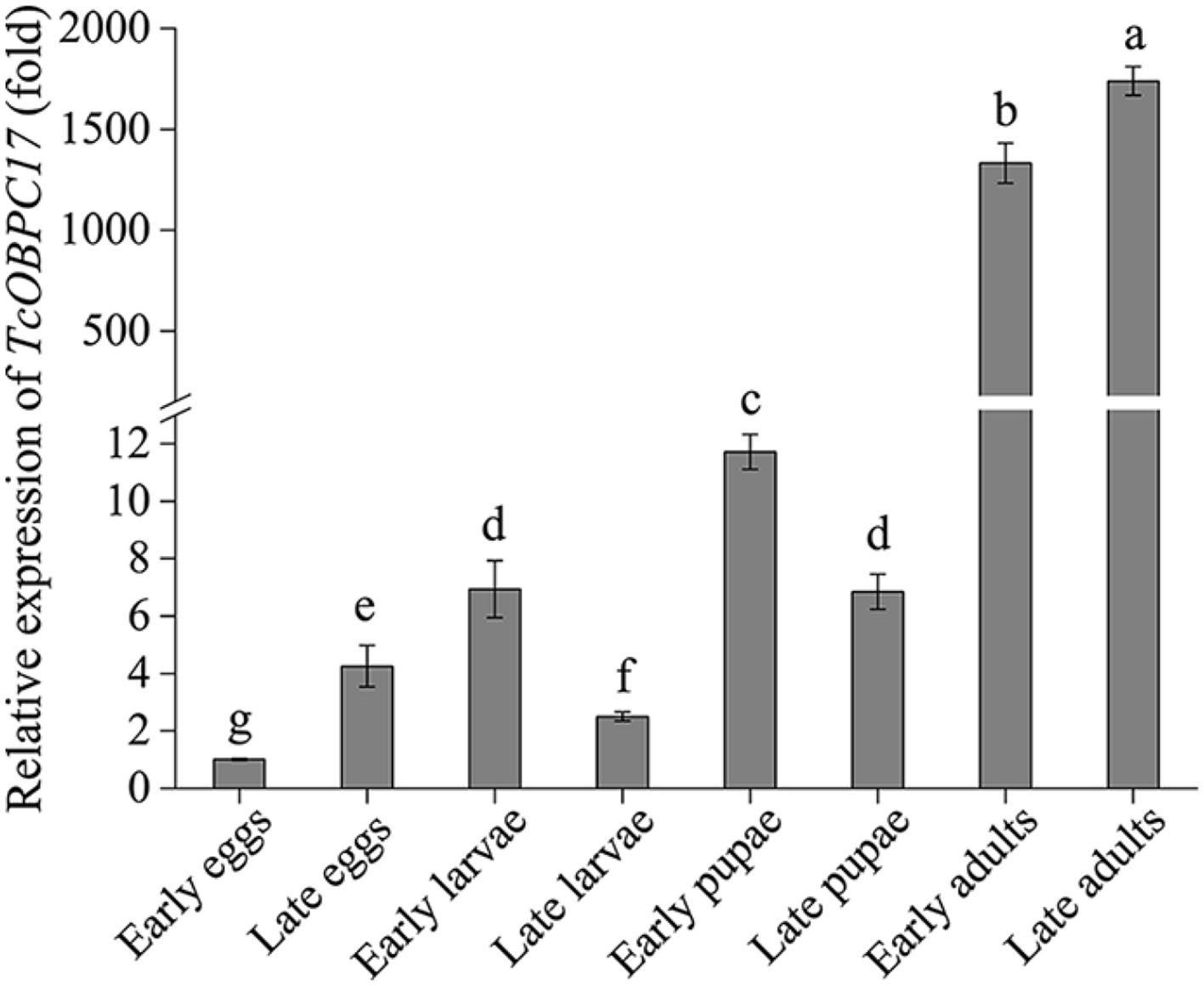 Expression of TcOBPC17 at eight different developmental stages of T. castaneum: early and late eggs (1 and 3 days old), early and late larvae (1 and 20 days old), early and late pupae (1 and 5 days old), early and late adults (1 and 10 days old). The transcript level of TcOBPC17 in early eggs was used as a calibrator of developmental expression profile. The bars represent standard errors of the means (n = 3–5). Fisher's least significant difference (LSD) test was employed to analyze the significant difference between the means, and different letters above the bars represent significant differences in means at P < 0.05.