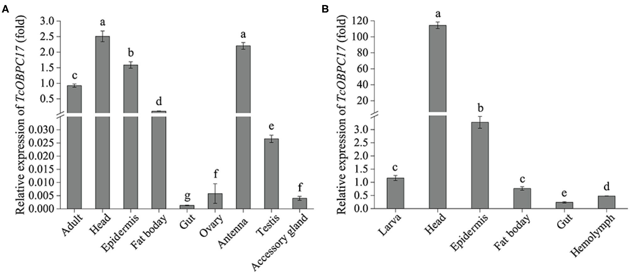 Expression levels of TcOBPC17 in different tissues of T. castaneum late larvae and adults. (A) Expression of TcOBPC17 was measured in different tissues of T. castaneum late adults, including the whole adult, head, epidermis, fat body, gut, ovary, antenna, testis, and accessory gland. (B) Expression levels of TcOBPC17 was detected in different tissues of T. castaneum late larvae, including the whole larva, head, epidermis, fat body, gut, and hemolymph. The transcript level of TcOBPC17 in the whole adult or larva served as the calibrator of tissue-specific expression profile. The bars represent standard errors of the means (n = 3). After logarithmic processing of TcOBPC17 levels, significant differences were subjected to Fisher's LSD test. Different letters above the bars represent significant differences in means at P < 0.05.