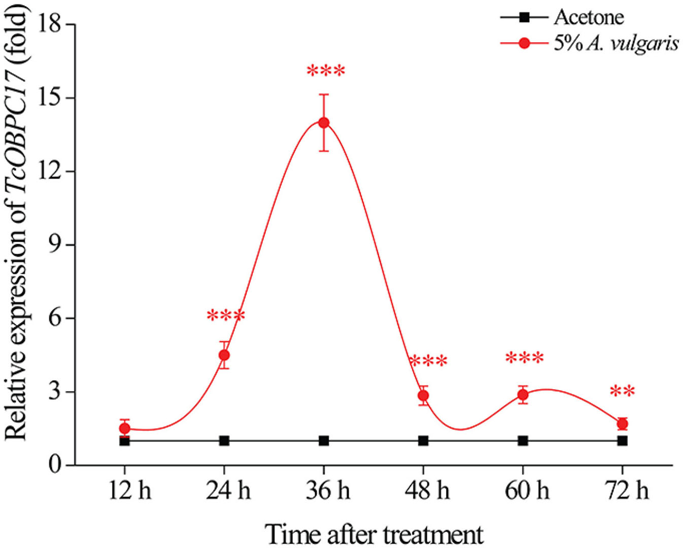 Relative expression level of TcOBPC17 after exposure to A. vulgaris EO or acetone. TcOBPC17 was measured 12, 24, 36, 48, 60, and 72 h after treatment with 5% A. vulgaris EO or acetone. The results are presented as means ± SE (n = 3). Student's t-test was employed to perform significant difference analysis (**P < 0.01, ***P < 0.001).