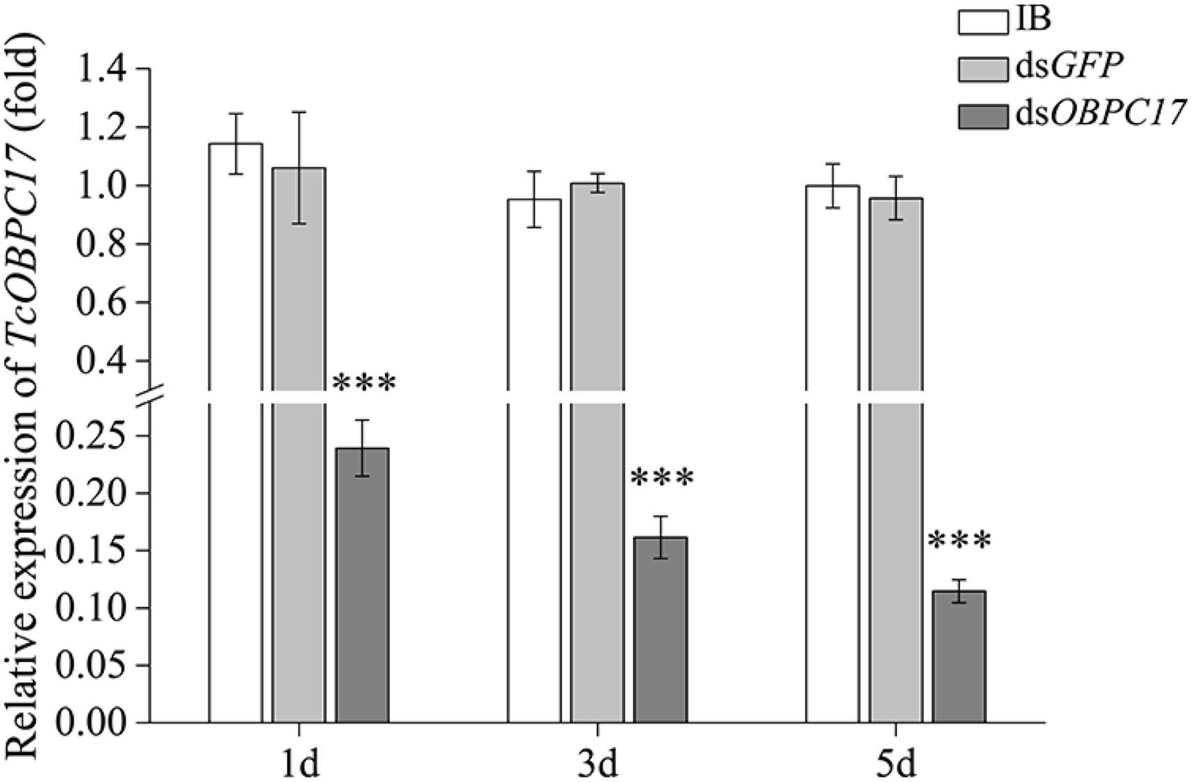 Relative expression level of TcOBPC17 mRNA in T. castaneum 1, 3, and 5 days upon dsOBPC17 injection. The larvae injected with the equal volume of water (IB) or dsGFP served as the controls. The bars represent standard errors of the means (n = 3). Fisher's LSD test was employed to analyze the significant differences between the means (***P < 0.001).