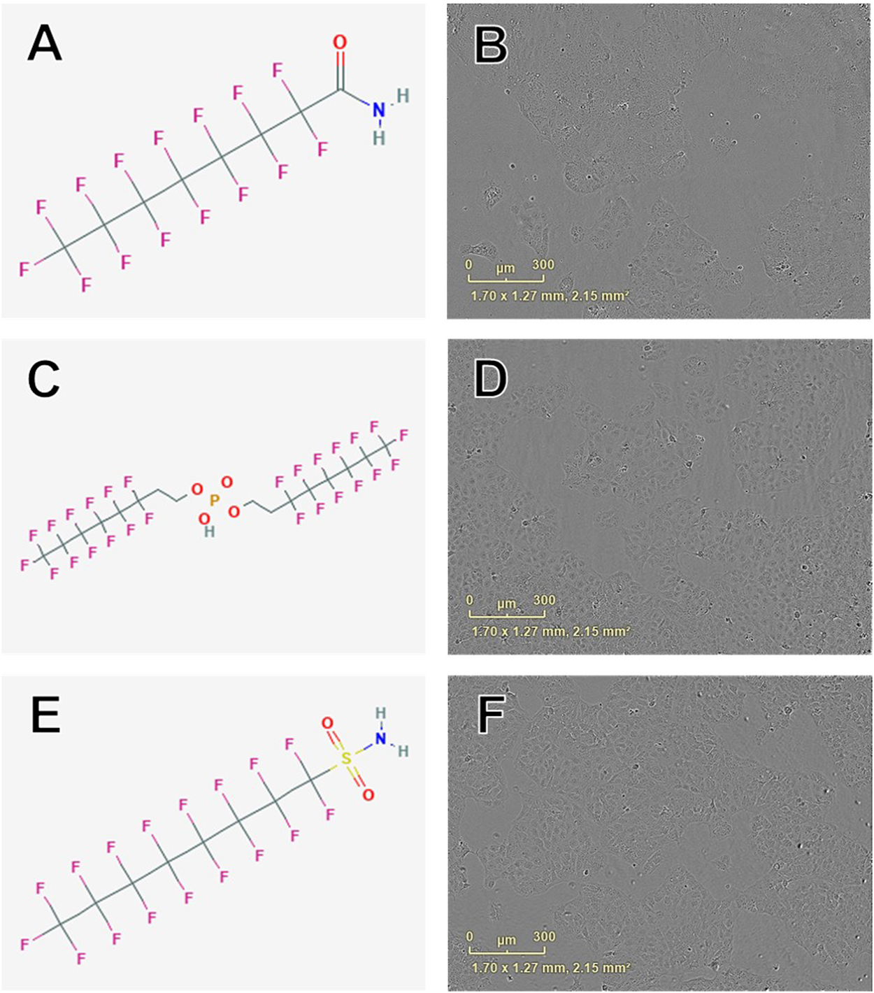 Examples of chemical structures and corresponding phase contrast live cell images obtained from JEG-3 cells after 24 h exposure to PFAS with most pronounced effects on cellular proliferation. (A) Structure of perfluorooctanamide (423-54-1; EC50 ± SE: 114.0 ± 35.6 µM); (B) Live cell image of cells exposed to 150 µM 423-54-1; (C) Structure of 6:2 fluorotelomer phosphate diester (57677-95-9; EC50 ± SE: 141.6 ± 39.4 µM); (D) Image of cells exposed to 150 µM 57677-95-9; (E) Structure of perfluorooctane sulfonamide (754-91-6; EC50 ± SE: 159.8 ± 90.0 µM); (F) Image of cells exposed to 150 µM 754-91-6. No overt cell death is apparent in (B), (D), or (F).