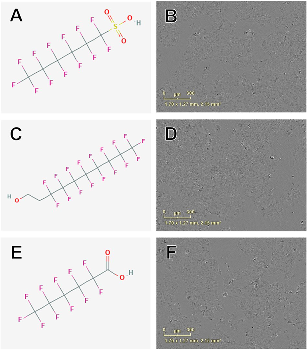 Examples of chemical structures and corresponding phase contrast live cell images obtained from JEG-3 cells after 24 h exposure to PFAS with most pronounced effects on mitochondrial membrane potential. (A) Structure of perfluorohexanesulfonic acid (355-46-4; EC50 ± SE: 86.2 ± 72.3 µM); (B) Live cell image of cells exposed to 150 µM 355-46-4; (C) Structure of 6:2 fluorotelomer alcohol (678-39-7 EC50 ± SE: 95.4 ± 17.1 µM); (D) Image of cells exposed to 50 µM 678-39-7; (E) Structure of perfluorohexanoic acid (307-24-4; EC50 ± SE: 140.9 ± 11.10 µM); (F) Image of cells exposed to 150 µM 307-24-4. No overt cell death is apparent in (B), (D), or (F).