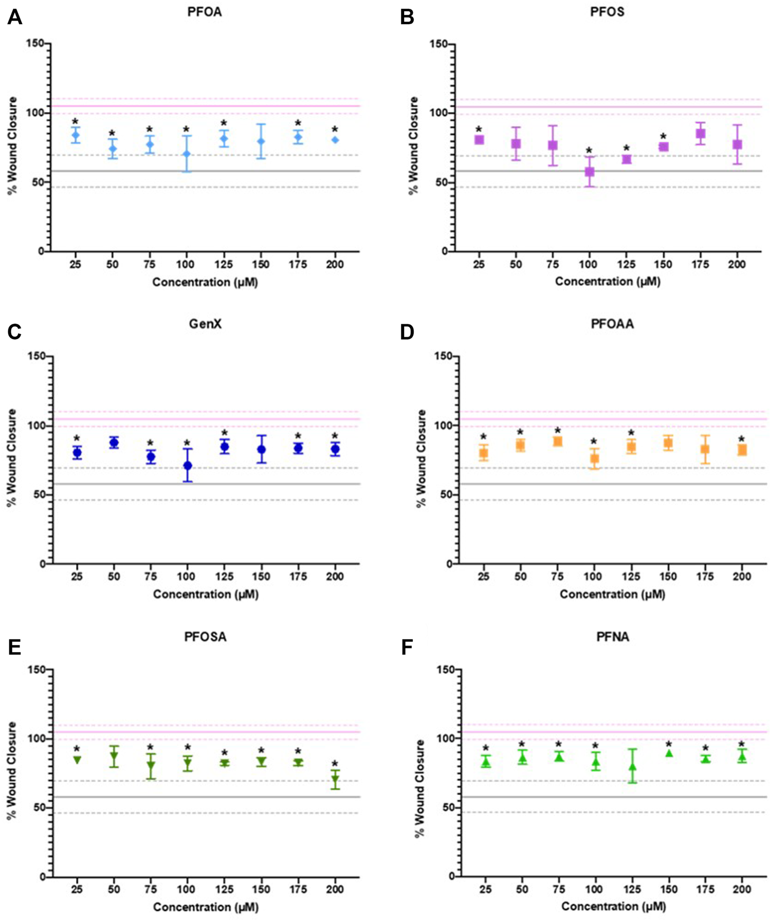 JEG-3 cells were cultured as described in Cell Culture section, and six PFAS were evaluated across an 8-point linear concentration curve ranging from 25 to 200 µM (25 µM steps): PFOA (335-67-1), GenX (62037-80-3), PFOS (1763-23-1), perfluorooctanesulfonamide (PFOSA, 754-91-6), perfluorooctanamide (PFOAA, 423-54-1), and perfluorononanoic acid (PFNA, 375-95-1). The vehicle control group consisted of 98% media + 2% methanol to match the concentration of methanol in the media at the highest PFAS concentration tested (200 µM). Cadmium chloride (25 µM) was used as a positive control for cytotoxicity (Brooks and Fry, 2017). Chemical exposure plate maps were designed so that all experimental conditions were tested in at least technical duplicates per plate. The outer edges of each plate received media alone and were excluded from all analyses to avoid edge effects. JEG-3 cells were counted and seeded at a density of 80,000 cells per well in black-walled, clear bottom 96-well plates (Corning #CLS3603, Millipore Sigma) and allowed to adhere and grow for 36 h. After approximately 36 h, 96-well plates were imaged on the IncuCyte Zoom to obtain cellular confluence measurements prior to chemical dosing (0 h). Media was then removed from wells and replaced with fresh serum-free media containing chemical treatments (serum-free exposure media) using the Viaflo liquid handling device. After 1 h of treatment with serum-free exposure media, plates were again imaged for cellular confluence using the IncuCyte Zoom. Serum-free exposure media was then removed from wells and wells were scratched by dragging a 200 µl pipette tip from top to bottom of each well, changing tips every well. Fresh media containing serum and chemical treatments (exposure media) was added to plates using a liquid handling device and allowed to grow for 72 h, with imaging via the IncuCyte Zoom every 6 h.