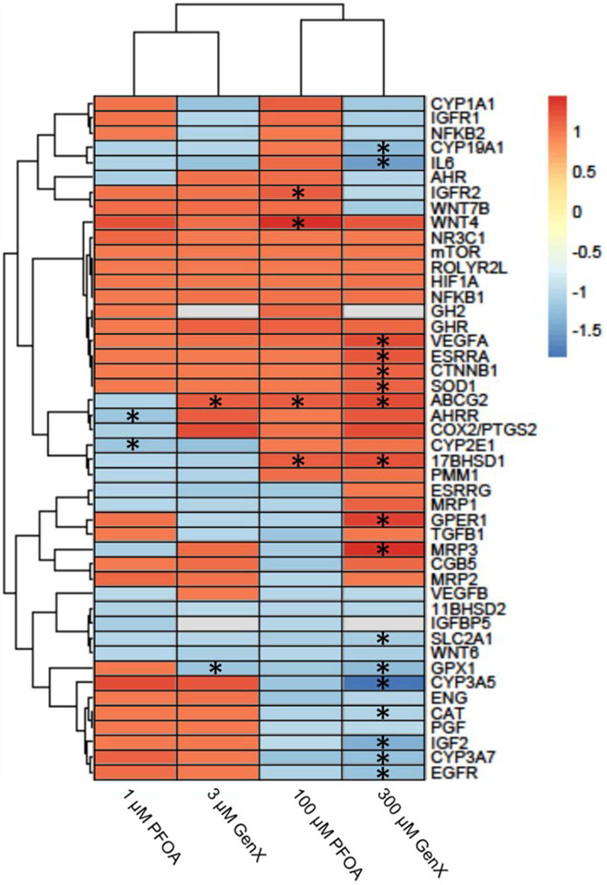 Gene expression data were quantified using the nCounter Digital Analyzer (NanoString, Seattle, WA, United States) and raw and adjusted counts were generated with nSolver (v4.0) software (NanoString, Seattle, WA, United States). Data were adjusted utilizing the manufacturer’s positive and negative experimental control probes, as well as housekeeping genes (ACTA2, ACTB, B2M, LDHA, RNA18S5, and ROLYR2L). All samples passed nSolver’s initial QA/QC controls and replicates were very well correlated with R2 values greater than 0.99. Adjusted data were then imported into Partek v7.0 (St. Louis, MO, United States), log2 transformed and quantile normalized for further QA/QC and statistical analyses. Genes with mRNA counts below the detection threshold of 20 were removed due to suboptimal probe hybridization (N = 2 genes for GenX; GH2 and IGFBP5). Fold change values were analyzed by ANOVA with post hoc false discovery rate adjustment (FDR) of p < 0.1. Normalized gene expression values were visualized using pheatmap with Euclidean clustering of genes and concentration groups (Kolde and Kolde, 2015).
