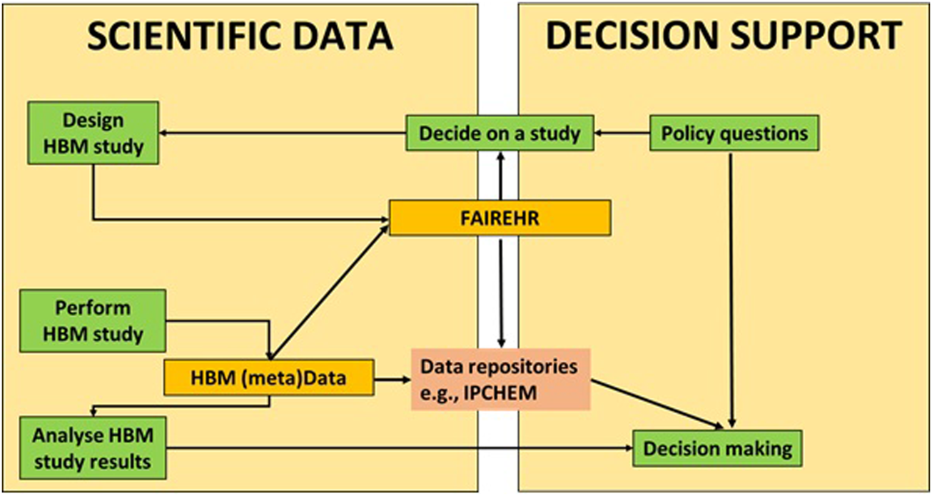 These protocol articles would include study background and design with descriptions of recruitment, sampling, chemical analysis (including acceptance criteria for the analysis), and statistical analysis as well as the data management plan. After completion of the study, ideally the data would be fed into a database for HBM data that then includes the link back to the FAIREHR, for retrieval of the full metadata. FAIREHR would provide an environment for HBM researchers to initiate an active HBM science network. The FAIREHR will enable researchers to consult with experts in the field to obtain insights in topics relevant for their research question. In addition, human and machine-readable metadata will enable automatic discovery of datasets and innovations to leverage science-based decision-making processes (at technical and policy levels) for public health.