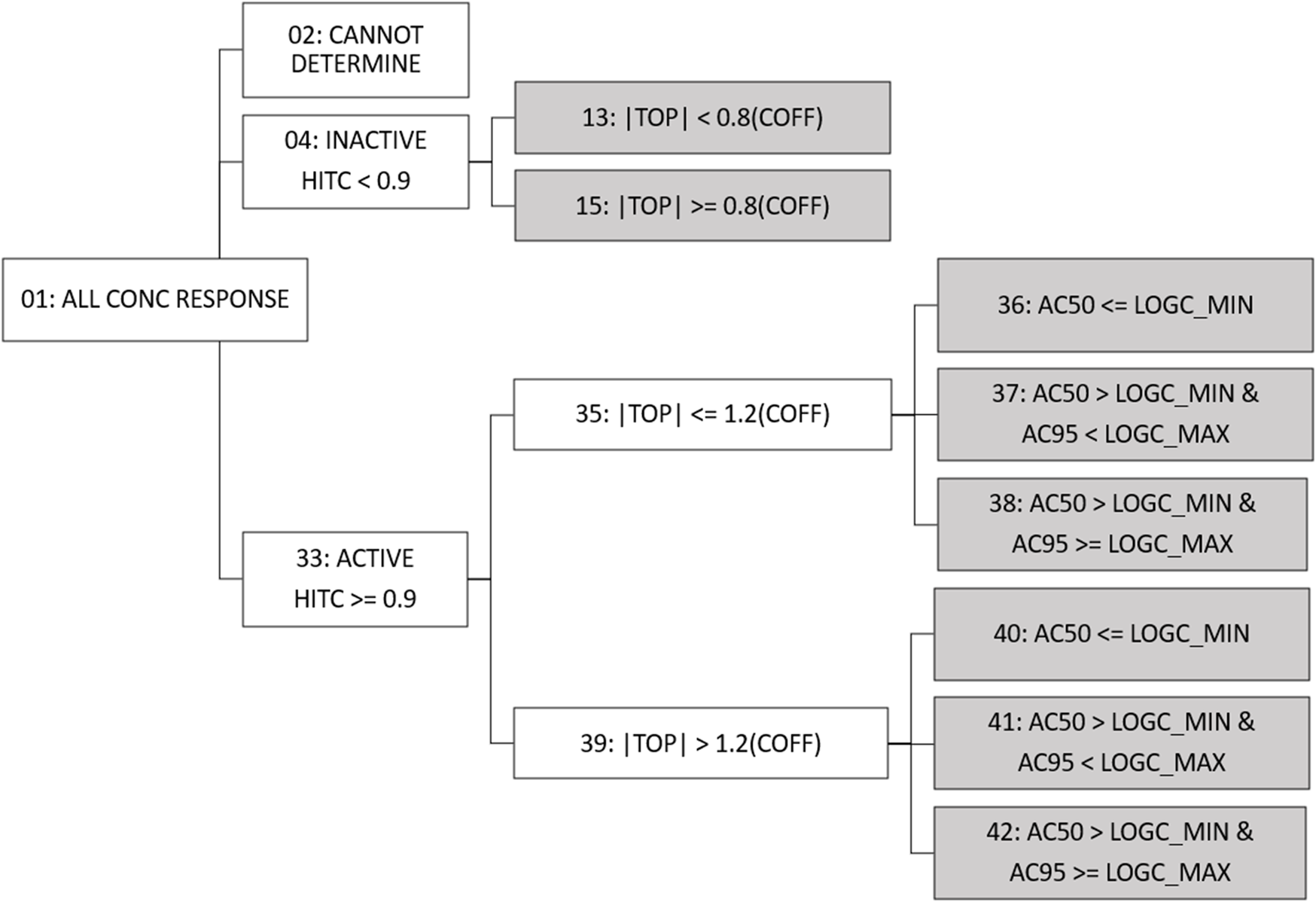 FIGURE 3. Fit Category Tree. All concentration series enter the fit category (fitc) hierarchical tree and move through activity, efficacy, and potency comparisons to assign final fitc (indicated by gray shading). For continuity purposes, fitc numbering has been conserved from past tcpl versions. Conc = concentration; hitc = hit call; |top| = absolute value of the modeled curve top; coff = cutoff; logc_min = minimum log10 concentration tested; logc_max = maximum log10 concentration tested; AC50 = 50% activity concentration; AC95 = 95% activity concentration.