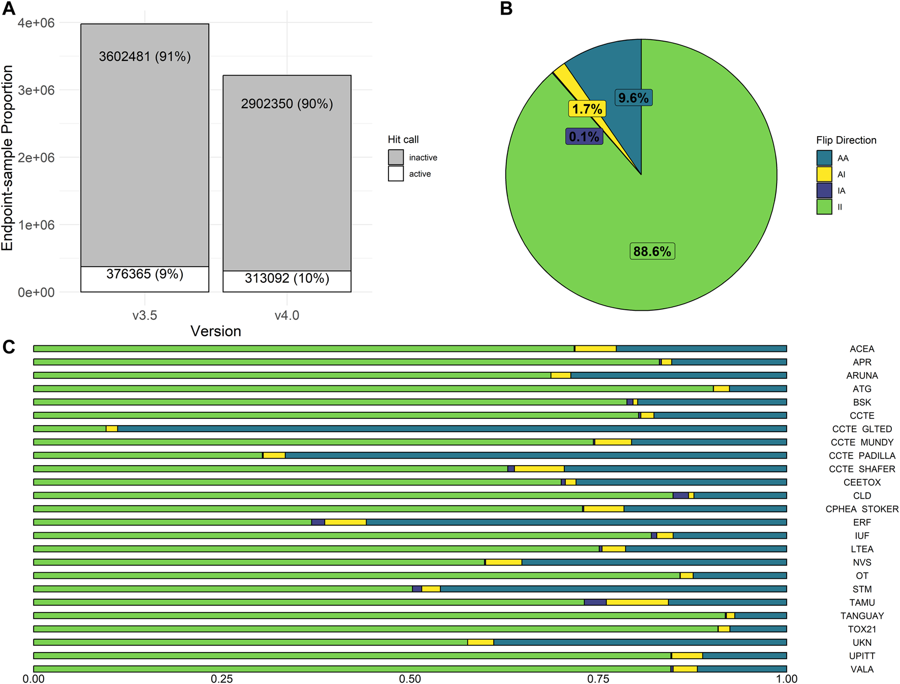 FIGURE 4. Activity Hit Call Shifts. In (A), the proportion of hit calls in invitrodb versions 3.5 and 4.0 are displayed. In (B), overall hit call change was examined, where possible flip directions include AA (sample was active in both v3.5 and v4.0), AI (active in v3.5, but inactive in v4.0), II (inactive in both v3.5 and v4.0), or IA (inactive in v3.5, but active in v4.0). II and AA represent no change in hit call determination. In (C), hit call change across assay sources is displayed.