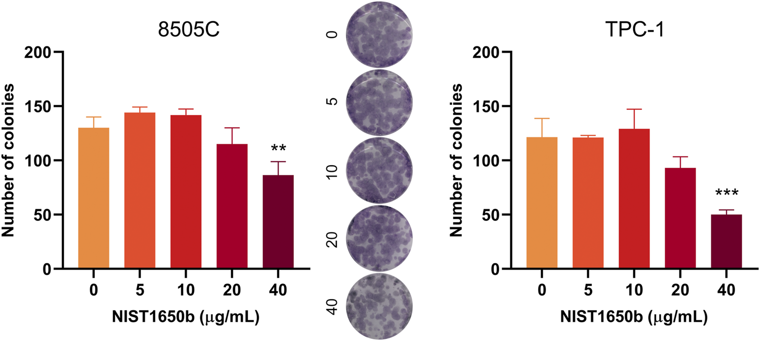We next examined whether exposure to diesel particulate matter affected clonogenicity, the ability of cells to retain their replicative integrity for a longer period of time. There were no significant changes in the number of formed colonies, except a decrease in colony number in thyroid cancer cells treated with 40 μg/mL NIST1650b (Figure 2). This finding suggests that diesel particulate matter interfered with colony formation in thyroid cancer cells only at high concentrations.