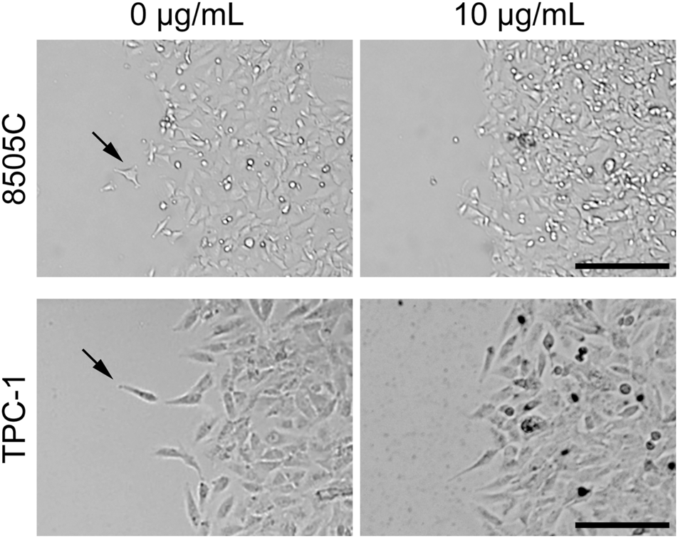 Representative phase-contrast microphotographs of thyroid cancer cells at the leading edge of wound closure following treatment with 10 μg/mL NIST1650b or DMSO vehicle control for 5 days. Arrows indicate cells departing from the leading edge into the wound area. Scale bar, 200 μm.