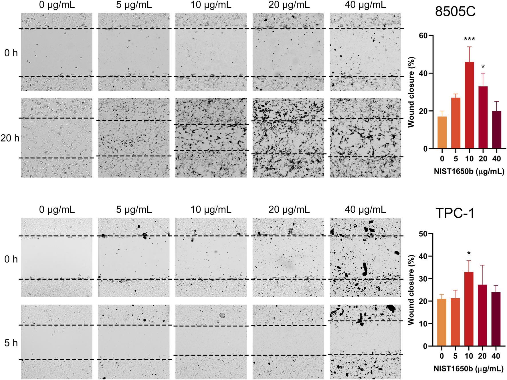 Effects of acute exposure to diesel particulate matter on collective cell migration in thyroid cancer cells. Human thyroid cancer cells 8505C and TPC-1 were treated with different concentrations of NIST1650b for 5 days followed by wound healing assay. ANOVA with Dunnett’s test: *, p < 0.05; ***, p < 0.001.
