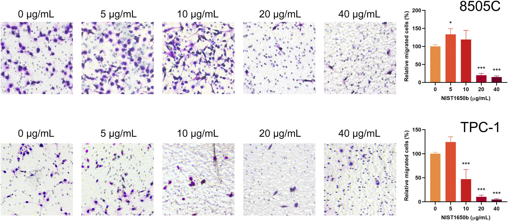 Following 5-day treatment with different concentrations of NIST1650b, about 6,000 cells were trypsinized and resuspended in serum-free media and seeded into transwell inserts (Corning Inc., Corning, NY, USA). The pore size of the transwell inserts was 8 μm. The lower chamber contained complete media containing 10% FBS as a chemoattractant (Kuo et al., 2022). After 24 h, the remaining cells that did not migrate from the top of the membrane were removed using cotton swabs. Cells migrating through the membrane were fixed, stained with Diff-Quik, and counted under a microscope.
