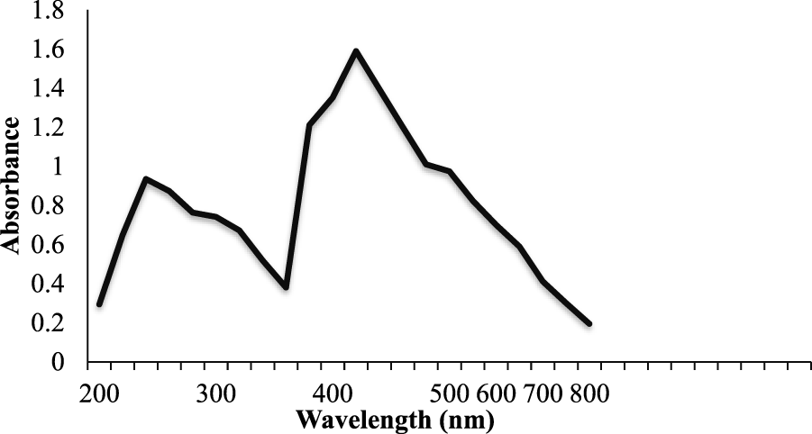 The green synthesis of the NCs was observed through UV visible double beam spectrophotometry, with a representative spectrum shown in Figure 2. The absorption peak was obtained at 420 nm with an absorbance (A) of 1.590. This is because the bandgap of Ag-Fe NCs is typically around 2.4 eV, which corresponds to a wavelength of light of about 500 nm (Wazu.K et al., 2008). Silver nanoparticles, in particular, are known for their strong surface plasmon resonance (SPR) properties. SPR in Ag-Fe NCs can lead to a sharp absorption peak in the visible range due to collective oscillations of electrons on the nanocrystal surface. SPR typically results in a sharp absorption peak in the visible range, often in the green to blue part of the spectrum. If the Ag-Fe NCs have a core-shell structure or contain silver nanoparticles on their surface, the presence of silver nanoparticles can contribute to an additional absorption peak related to SPR.