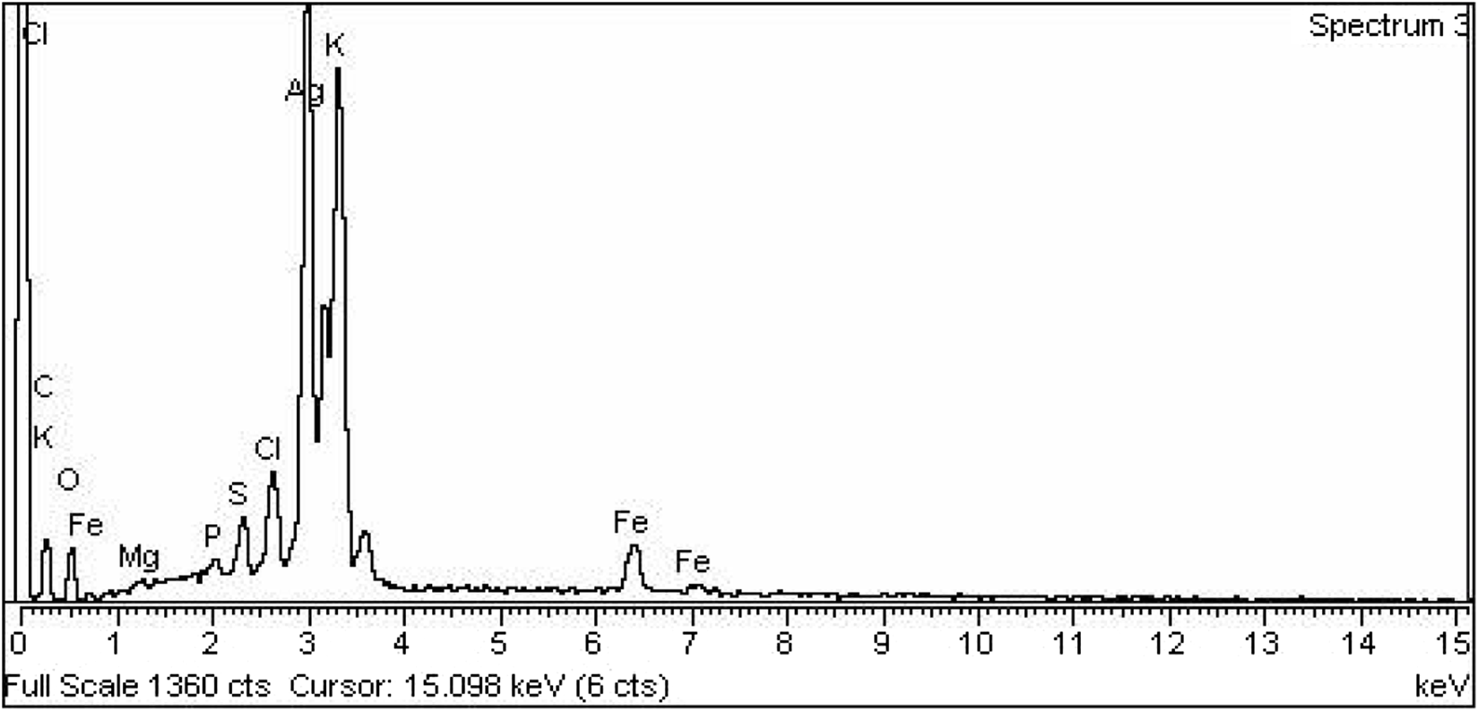 EDX spectroscopy was used for the elemental analysis. The strong peak was observed for Ag with a % weight of 50.36, while the observed % weight of Fe and O were 5.94 and 15.46 respectively (Table 1). Table 1 displays the percentage of other elements phosphorous, sulfur, and magnesium indicating that these elements are from plant extract because plants absorb these from the soil. Based on the EDX study the proposed chemical formula of the nanocomposite is Ag3O2Fe.