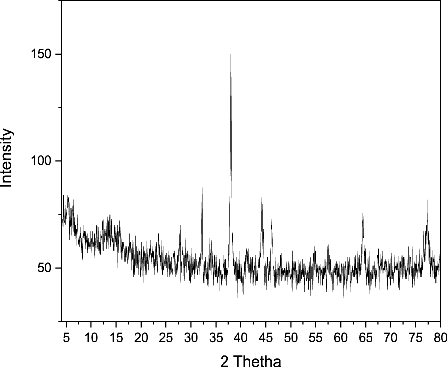 The XRD pattern (Figure 5) indicates that the composite material was synthesized in the nano-scale range. The 2θ values were observed at 38, 32.5, 43, 46, 64.9, and 77.5. Based on the 2θ values the strongest peak at 38° corresponds to an interplanar spacing of 1.25117 Å. This is the (111) plane spacing of a face-centered cubic (fcc) material. The other peaks can also be indexed to the fcc crystal structure, but they are weaker, which suggests that the nanomaterial is not perfectly spherical. The most likely shape of the nanomaterial is a sphere or a cube with some surface defects. The average size of the nanomaterial was 12.6 nm, based on the Scherer, equation i.e.,