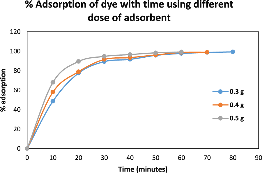 The effect of the adsorbent on the adsorption of AB-234 dye by the prepared NCs was studied. Different amounts of NCs, ranging from 0.1 to 0.5 g, were added to 100 mg/L AB-234 dye. Furthermore, 5 mL solution of the optimized pH 4 solution was added to each flask and shaken for 5 min. Filtration was performed, and the filtrate was measured against a reagent blank. It was observed that on increasing the amount of NCs the % adsorption increases due to the availability of more active sites of adsorption. The time of adsorption is decreasing as we increase the dose of NCs.