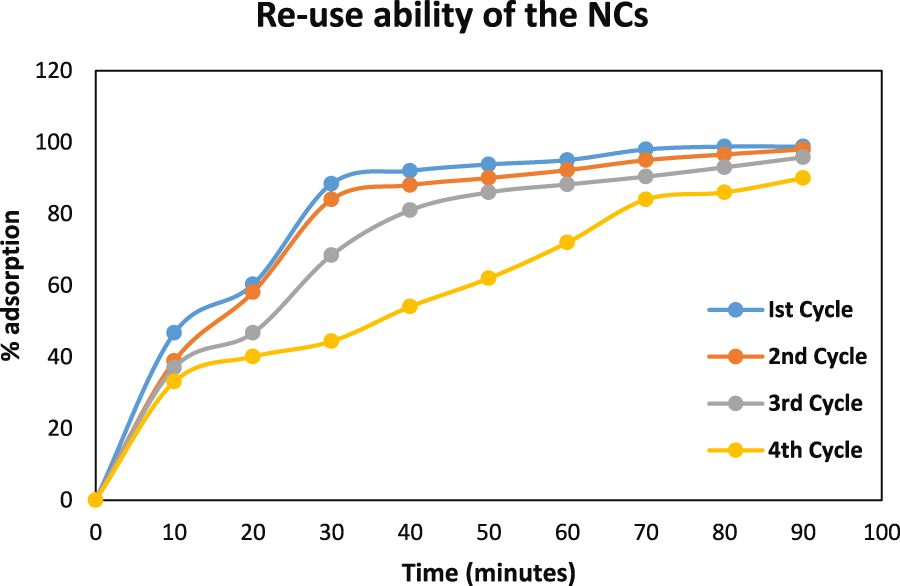 The potential for recyclability of NCs within the degradation process of AB-234 dye was investigated in four cycles for 120 min each. The NCs was regenerated on heating at 70°C for 90 min following each utilization. The NCs were separated by decantation, rinsed with distilled water, and then subjected to drying in an oven at 70°C for a duration of 2 h. The NCs was cooled at room temperature and then used in the degradation of a fresh solution of 100 mg/L AB-234 dye. The adsorption efficiency of NCs was monitored after each cycle, and the outcomes were graphically represented in Figure 9. The adsorption ability of synthesized NCs on AB-234 dye was observed to have a very small decline from 98.8% (first time) to 90% fourth time). The minor reduction in adsorption efficiency observed in each successive recycling cycle can be ascribed to the adsorption of dye molecules on the active sites of the NCs. These findings validate the NCs capacity to be reused as adsorbents for at least four cycles.