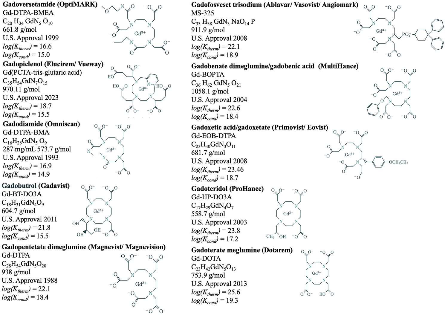 Magnetic resonance imaging contrast agent chemical structures, formulae, United States approval years, thermodynamic (log(Ktherm)) and conditional [log(Kcond)] stability constants.