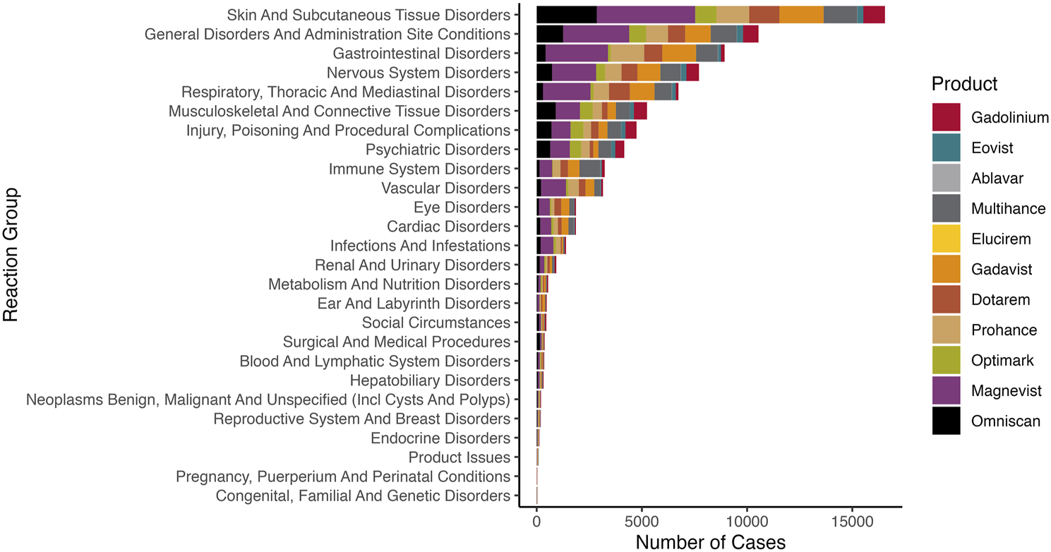 Gadolinium-based contrast agents are increasingly associated with cutaneous and systemic abnormalities in patients with normal renal function. Gadolinium-based contrast agent-associated sclerotic plaques have been documented in patients with varying degrees of renal function without additional clinical features of nephrogenic systemic fibrosis (Gathings et al., 2015). A 2019 single-patient case report described a skin biopsy with deep dermal fibrosis, sclerotic bodies, and CD34 positivity consistent with a cutaneous reaction to gadolinium, which was confirmed present in the sample by inductively coupled plasma mass spectrometry (Olayiwola et al., 2019). Data mining of the United States Food & Drug Administration Adverse Event Reporting System corroborates that skin complications relate to most brands of magnetic resonance imaging contrast agents (Wang et al., 2023). As of 30 September 2023, 31,868 reactions were reported to the United States Food & Drug Administration Adverse Event Reporting System (Figure 2). The leading reaction group for all magnetic resonance imaging contrast agents is skin and subcutaneous tissue disorders (including nephrogenic systemic fibrosis).