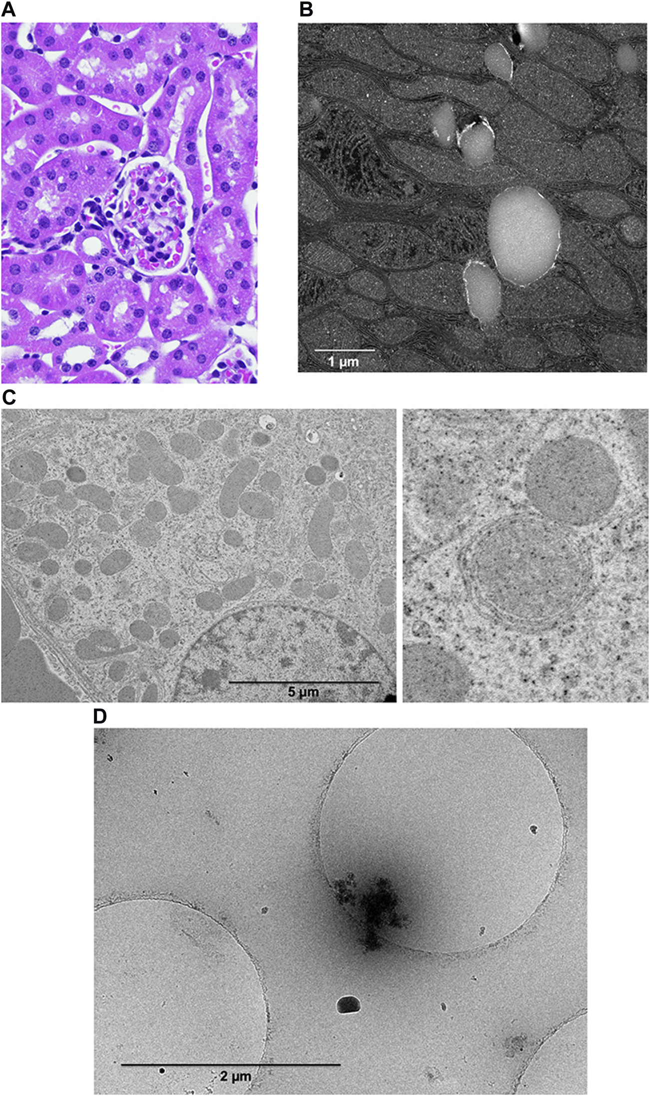 Systemic treatment with magnetic resonance imaging contrast agents induces the formation of gadolinium-rich nanoparticles. (A). Renal cortex from magnetic resonance imaging contrast agent-treated mice may demonstrate subtle vacuolization by light microscopy. We obtain tissues 5 days or more after the last magnet resonance imaging contrast agent exposure. (B) Transmission scanning electron microscopy (darkfield mode) reveals unilamellar bodies rimmed with electron-dense material and mitochondrial swelling. FEI Tecnai G (2) S-Twin (300 kV) transmission electron microscope. (C) Transmission electron microscopy of a renal proximal tubular cell from a magnetic resonance imaging contrast-treated mouse. The shrunken, ballooned mitochondria are no longer oriented perpendicularly to the basolateral plane. The enlarged image demonstrates mitochondrial stress. (D) Cryo-transmission electron microscopy of nanoparticles from renal cortices from magnetic resonance imaging contrast agent-treated mice that were purified by ultracentrifugation through a sucrose gradient. The image shows a nanoparticle with an organic corona.