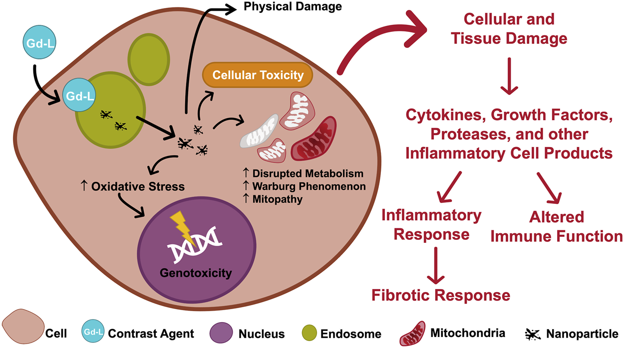 Case reports of neurologic damage (often permanent) and encephalopathy (sometimes fatal) incriminate small doses of gadolinium in profound biologic sequelae. The position that intracellular, foreign, rare earth metallic nanoparticles have no impact on cellular function is indefensible prima facie. Existing data suggests that nanotoxicity mediates complications induced by magnetic resonance imaging contrast agents (Figure 4).