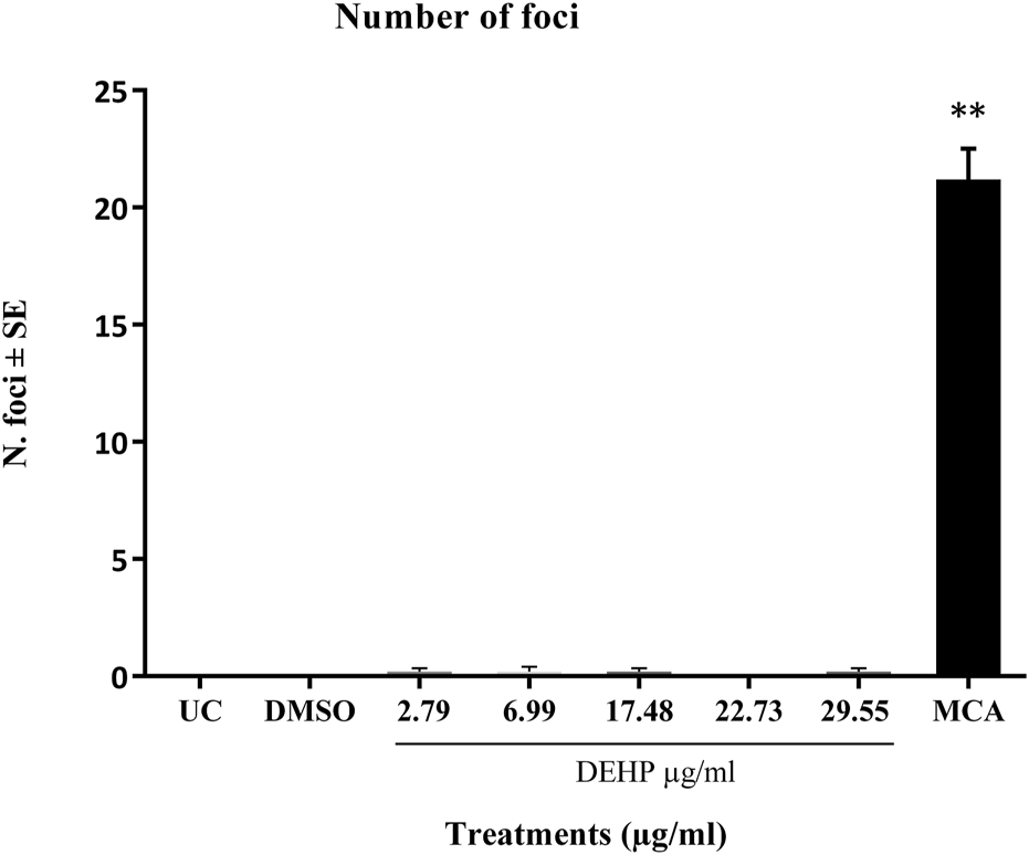 The effect of DEHP on the transformation frequency of BALB/c 3T3 A31-1-1 cells was assessed according to the protocol recommended by ECVAM (Sasaki et al., 2021a; Corvi et al., 2012; Tanaka et al., 2012; IARC, 2013; Mascolo et al., 2018).