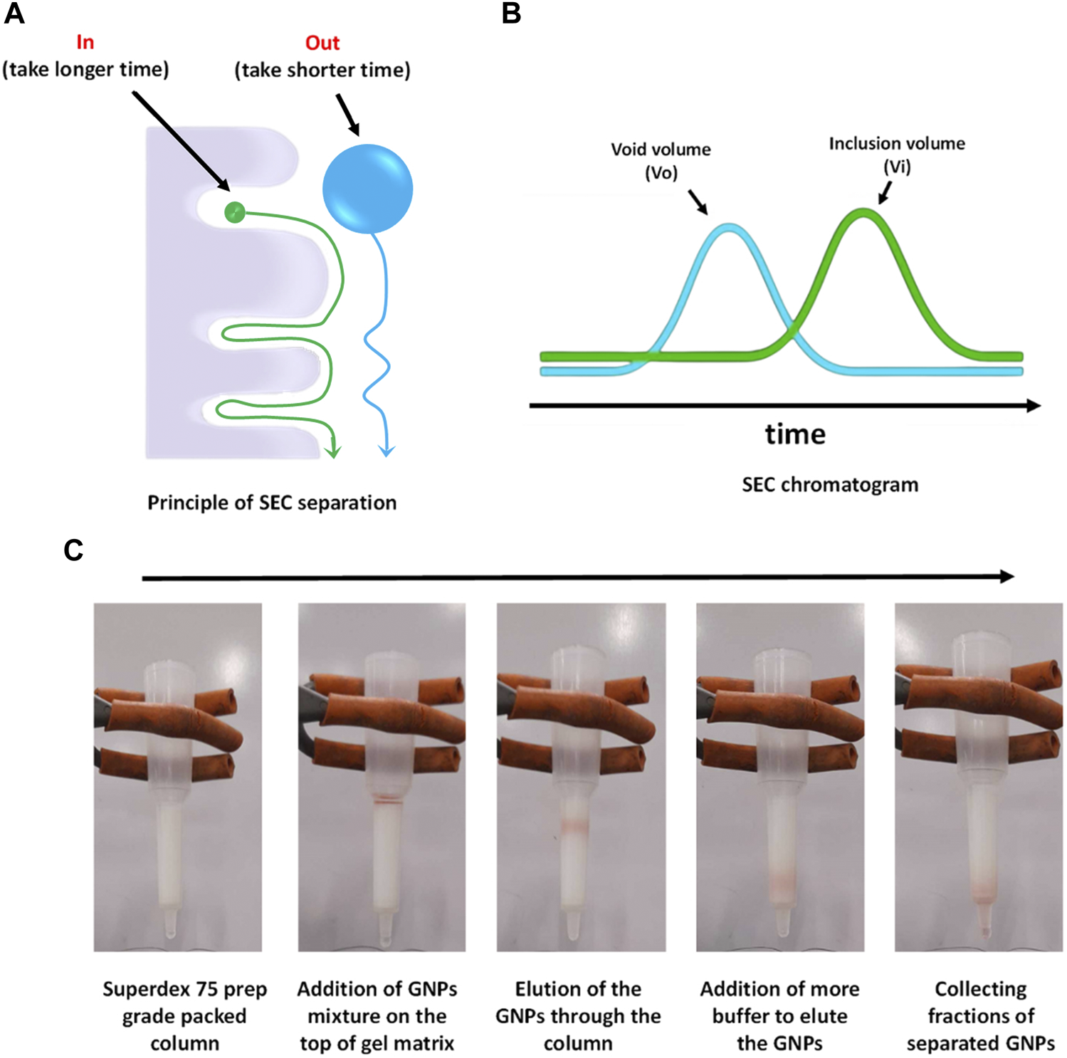 SEC conceptual scheme and procedures. (A) Principle of SEC separation, (B) typical SEC chromatogram, and (C) separation process of GNPs from human plasma using Superdex 75 prep grade packed in a syringe column.
