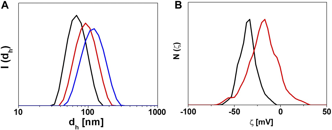 Jans et al., 2009). DLS measures the change in the intensity of scattered lights due to the change in Brownian motion of the NP and NP-conjugates to calculate the particle diffusion coefficient, which is then related to hydrodynamic radius via the Stokes-Einstein equation. DLS provide detailed information on particle size distribution, including hydrodynamic size-based intensity distribution, intensity-weighted mean hydrodynamic size (Z-average), polydispersity index, among others (