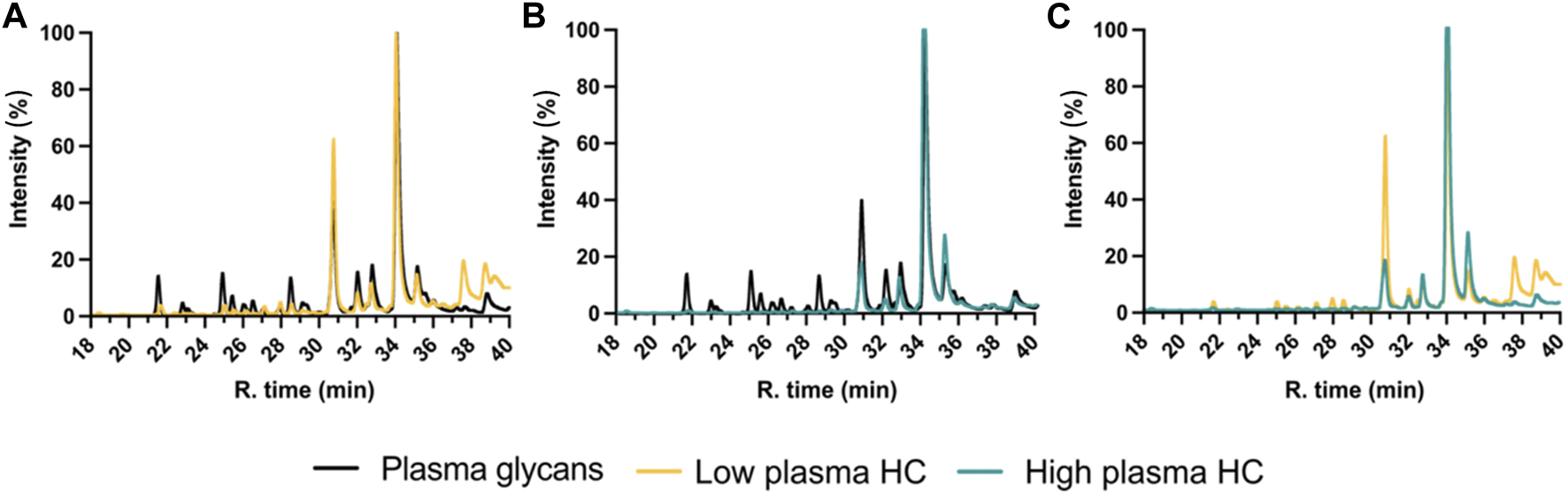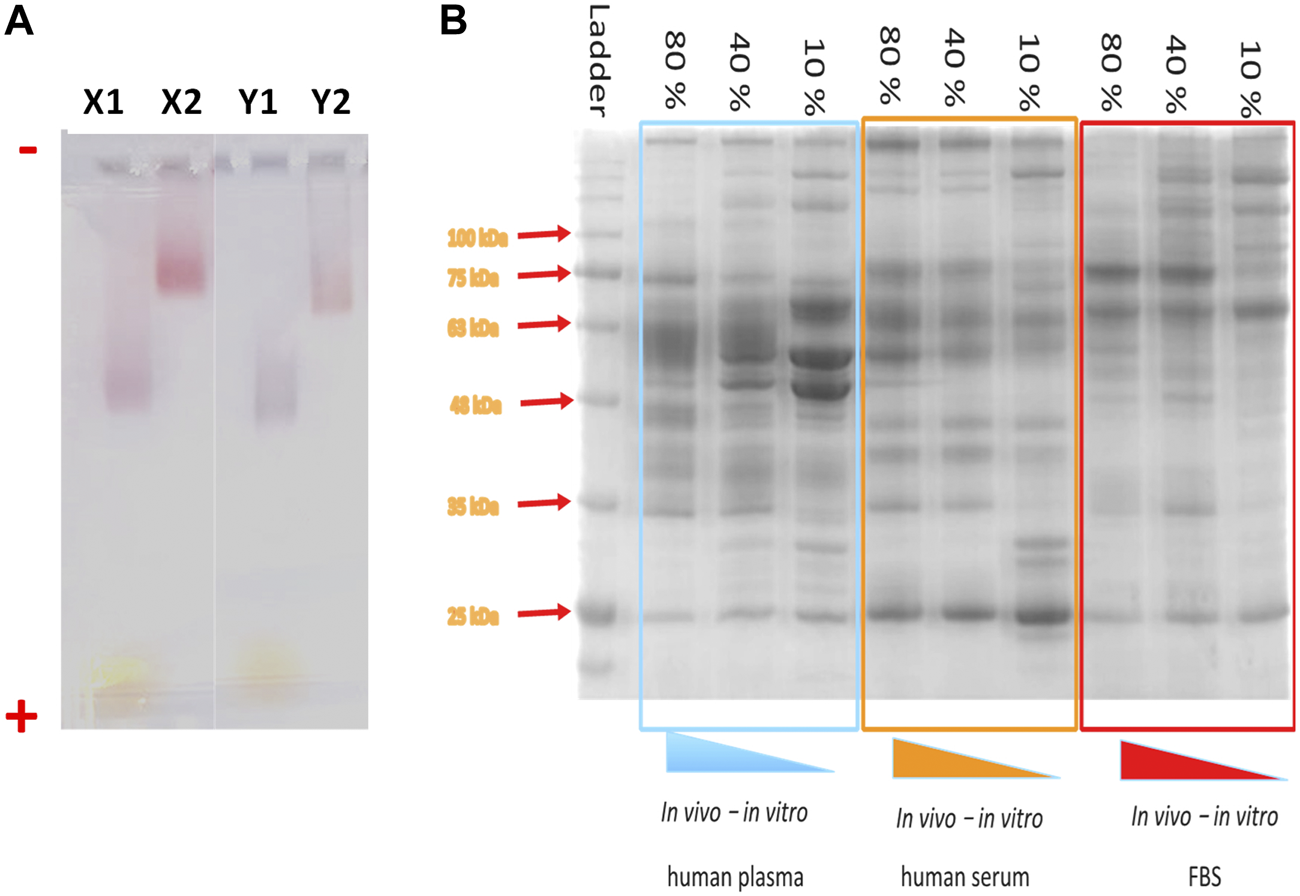 Human blood plasma (plasma) or serum can be obtained from multiple sources, such as commercial sources, local blood transfusion centers, blood transfusion from healthy volunteers or a cohort of disease patient groups. IONPs were received from Colorobbia under the funding of the European Union’s Horizon 2020 research and innovation program (BioRima project, grant agreement No 760928). Gold NPs and gold nanorods were synthesized according to established protocol by Soliman et al. (Soliman et al., 2015) Imperial™. Silica NPs (PSI-0.1) were purchased from Kisker Biotech (Germany). Carboxylated polystyrene microspheres 0.10 μm (16,688) were purchased from Polysciences. Tris-HCl, glycerol, sodium dodecyl sulfate (SDS), ammonium bicarbonate, formic acid (FA), ethylenediaminetetra acetic acid (EDTA), dithiothreitol (DTT), phosphate buffer saline (PBS), acetonitrile (ACN), agarose, iron atomic spectroscopy standard solution, acetic acid, hydrochloric acid, orange G, hydrogen peroxide (H2O2), Iodoacetamide, Sucrose, uranyl acetate, Tris-borate, Tris-acetate, indole-3-acetic acid, ammonium bicarbonate, trifluoroacetic acid, dimethyl sulfoxide (DMSO), and β-mercaptoethanol were purchased from Merck Life Science Limited (Ireland). Protein Stain 40% acrylamide/bisacrylamide, and SDS-PAGE Loading Buffer were purchased from Thermo Fischer Scientific Ireland. Orange G loading dye was purchased from Alfa Aesar. Neodymium external magnetic bar (42 x 8 × 10 mm thick N42 Neodymium Magnet - 14 kg Pull) was purchased from first4magnets (United Kingdom). The LudgerZyme PNGaseF (LZ-PNGF-150), Ludger Tag Procainamide Glycan Labeling Kit (LT-KPROC-24), Ludger-Clean Procainamide Clean-up Plate (LC-PROC-96), 50 mM ammonium formate buffer pH 4.4 LS-N-BUFFX40), LudgerTag™ DMB Sialic Acid (LT-KDMB-96) and LudgerSep-uR2 UHPLC column were purchased from Ludger Ltd. (United Kingdom). The ACQUITY UHPLC BEH-Glycan 1.7 μm, 2.1 × 150 mm column was purchased from Waters. Carbon film 300 mesh TEM grids were purchased from Agar Scientific (United Kingdom). Superdex 75 Prep Grade was purchased from Cytiva (Ireland). PVC Standard 0.544 nm was purchased from Analytik Ltd. (United Kingdom). Eppendorf microcentrifuge tubes were used for all experiments. The use of low protein binding tubes is recommended to reduce plasma protein and NPs adsorption. All solutions and suspensions were prepared in double-distilled water (resistivity of 18.2 MΩ cm). Protective equipment must be always worn (safety glasses, disposable gloves, and a laboratory coat).