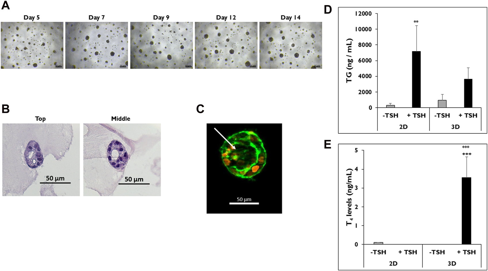 Thyrocytes in 3D culture form microtissues. (A) Representative images of microtissues on days 5, 7, 9, 12, and 14 in 3D culture. Magnification ×40. Scale bar = 50 µm. (B) H&E staining of microtissues, including follicle-like structures, from top to middle on day 12. Magnification ×200. Scale bar = 50 µm. (C) Follicle-like morphology of microtissue stained with DAPI (orange) and phalloidin (green) on day 9. Arrow indicates luminal space absent of cell staining. Magnification ×100. Scale bar = 50 µm. Representative data from one donor for levels of (D) thyroglobulin (TG) on day 7 and (E) Thyroxine (T4) on day 14 from thyrocytes in 2D and 3D culture treated without (grey bars) and with (black bars) TSH. 7,500 cells per well were seeded for each culture condition. Cells were treated with Thyroid Stimulating Hormone (1.0 mIU/mL). One-way ANOVA with Tukey for stats. Error bars represent standard deviation. n = 3 replicates from three donor lots. **p < 0.005 to–TSH 2D for TG. ***p ≤ 0.001 to -TSH 3D; +++ p ≤ 0.001 to + TSH 2D for T4.