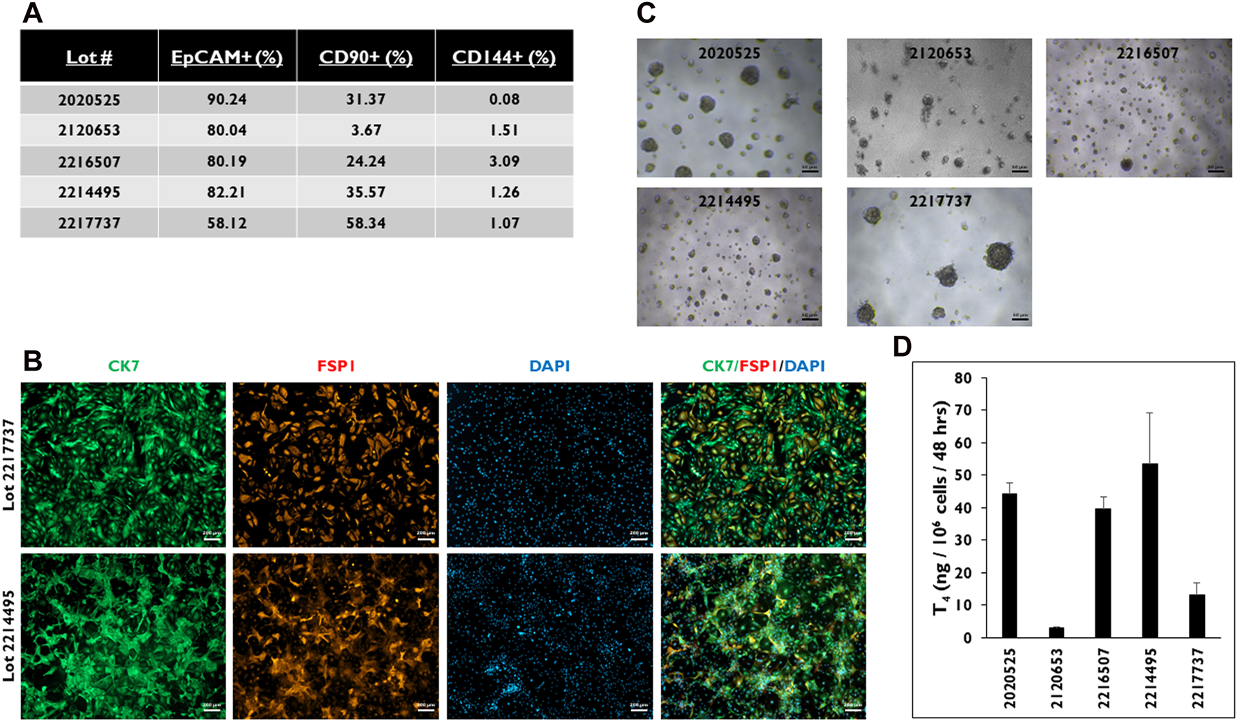 Characterization of the cell population from five donor lots determined by FLOW. (A) Percentage of cells stained positive for EpCAM, CD90, and CD144. > 0.5 × 106 viable cells were used for each of the five donor lots. (B) Representative images of thyrocyte cells from donor lots 2217737 (top row) and 2214495 (bottom row) in 2D culture stained for Cytokeratin 7 (CK7, green), Fibroblast-specific protein 1 (FSP1, red), and DAPI (blue), and three channels merged. Magnification ×50. Scale bar = 200 µm. (C) Representative images of microtissues in 3D culture seeded at 7,500 cells per well and (D) levels of Thyroxine (T4) from microtissues in 3D culture on day 14. Cells were treated with Thyroid Stimulating Hormone (1.0 mIU/mL). Magnification ×40. Scale bar = 50 µm. Error bars represent standard deviation. n ≥ 3 replicates from five donor lots.