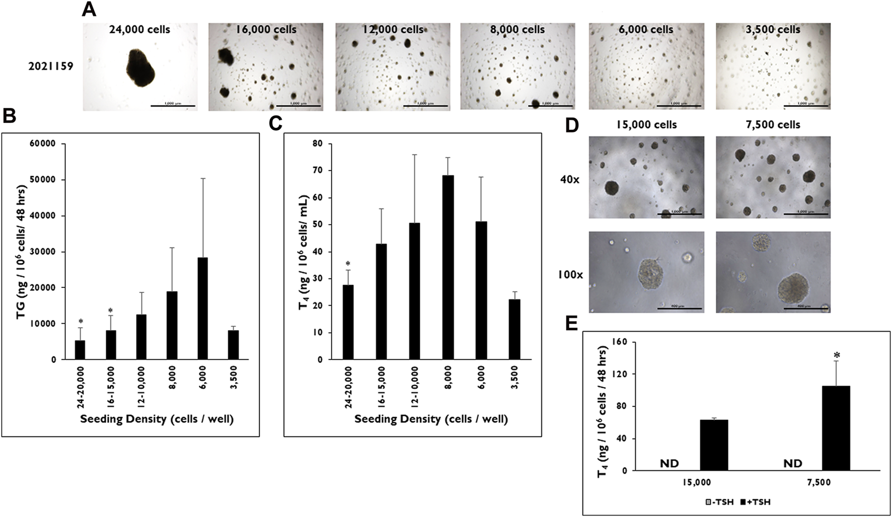 The effect of seeding density range on microtissue formation and function in 3D culture. (A) Representative images of microtissue formation on day 14 when 24,000, 16,000, 12,000, 8,000, 6,000, and 3,500 cells are seeded per well. Magnification ×40. Scale bar = 1,000 µm. (B) Thyroglobulin (TG) and (C) Thyroxine (T4) levels were determined at various seeding density ranges from 24 to 20,000 cells per well to 3,500 cells per well. Values were normalized to the number of cells seeded per well. *p < 0.05 to 6,000 cells per well for TG (One-way ANOVA with Tukey). *p < 0.05 to 8,000 cells per well for T4 (One-way ANOVA with Tukey). n ≥ 2 replicates from three donor lots for TG and two donor lots for T4 analysis. (D) Representative images of microtissues on day 9 from donor lot 2313606 formed when cells were seeded at 15,000 and 7,500 cells per well. Magnification at ×40 (top row) and ×100 (bottom row). Scale bar = 1,000 μm and 400 µm. (E) T4 levels on day 14 were measured from microtissues (donor lot 2313606) formed when cells were seeded at 15,000 cells per well and 7,500 cells per well. Cells were treated with Thyroid Stimulating Hormone (0.3 mIU/mL). *p < 0.05 to 15,000 cells per well + TSH. One-way ANOVA with Tukey for stats. n = 5 replicates from one donor lot. Error bars represent standard deviation.