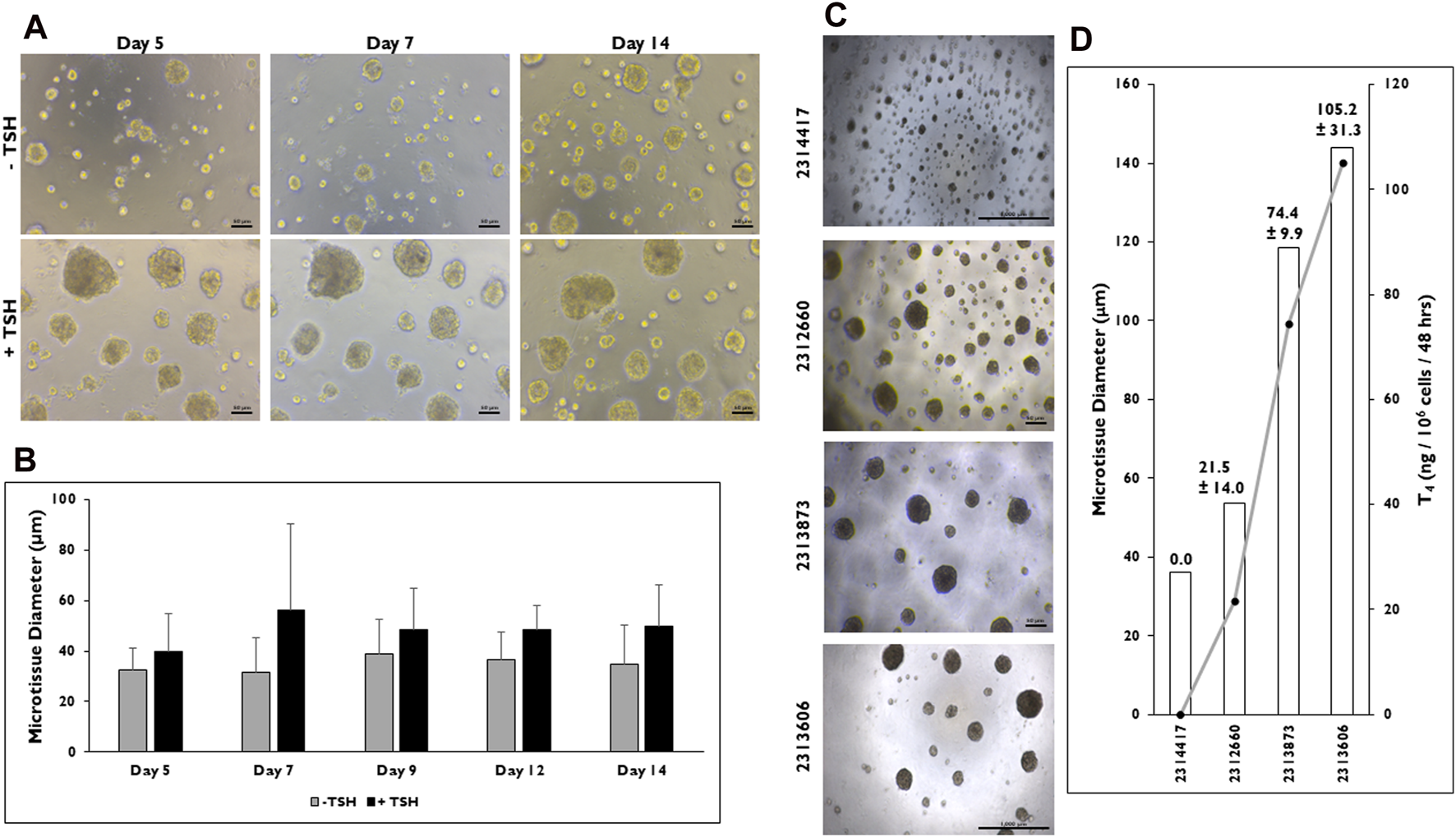 Microtissue size can be correlated to T4 synthesis in 3D culture. (A) Representative images of microtissues on days 5, 7, and 14 that have been treated without (−) or with (+) Thyroid Stimulating Hormone (TSH) (0.3 mIU/mL) seeded at 7,500 cells per well beginning at day 2. Magnification ×100. Scale bar = 50 µm. (B) Measurements of microtissue diameter (µm) on days 5, 7, 9, 12, and 14 without (grey bars) and with (black bars) TSH treatment. n = 10 microtissues from one donor lot. (C) Representative images of microtissues on day 12 from four donor lots when cells were seeded at 7,500 cells per well and treated with TSH (0.3 mIU/mL). Magnification ×40. Scale bar = 1,000 µm for donor lots 2314417 and 2313606. Scale bar = 50 µm for lots 2312660 and 2313873. (D) Levels of T4 synthesis (grey line) from four donor lots correlated to microtissue diameter (µm) on day 14. T4 values were normalized to number of cells seeded per well. n ≥ 10 microtissues measured and n = 5 replicates from four donor lots for T4 levels. Errors bars represent standard deviation.