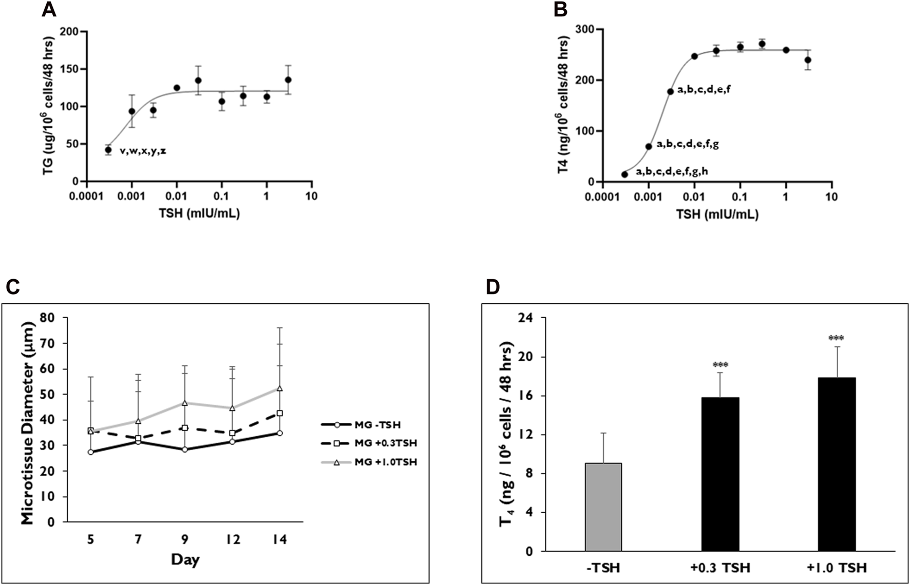 TSH concentration effects on TG and T4 synthesis from thyrocyte microtissues in 3D culture. Representative levels of (A) Thyroglobulin (TG) on day 7 and (B) Thyroxine (T4) on day 14 were measured when microtissues in 3D culture were stimulated with varying concentrations of Thyroid Stimulating Hormone (TSH) ranging from 0.0003 to 3 mIU/mL. Non-stimulated microtissues (0 TSH) secreted measurable levels of TG (31.7 ± 9.5 µg/106 cells/48 h). Non-stimulated microtissues (0 TSH) produced T4 (17.63 ± 1 ng/106 cells/48 h). p < 0.05 to 0.01 mIU/mL (indicated by z), 0.3 mIU/mL (indicated by x) and 1 mIU/mL (indicated by w) for TG. p < 0.01–0.03 mIU/mL (indicated by y) and 3 mIU/mL (indicated by v) for TG. p < 0.01 to 0.001 mIU/mL (indicated by h) for T4. p < 0.001–0.003 mIU/mL (indicated by g), 0.01 mIU/mL (indicated by f), 0.03 mIU/mL (indicated by e), 0.1 mIU/mL (indicated by d), 0.3 mIU/mL (indicated by c), 1 mIU/mL (indicated by b), 3 mIU/mL (indicated by a) for T4. One way ANOVA with Tukey. n = 3 replicates from two donor lots. Values were normalized to 7,500 cells per well. (C) Microtissue diameter was determined on days 5, 7, 9, 12, and 14 for cells seeded in Matrigel® (MG) after treatment without (black line, circles) or with 0.3 (dotted line, squares) and 1.0 (grey line, triangles) mIU/mL TSH beginning on day 2. n ≥ 5 images from one donor lot. (D) Levels of T4 synthesized from microtissues when treated with 0.3 and 1.0 mIU/mL TSH on day 14. ***p < 0.001 to–TSH. n ≥ 5 replicates from one donor lot. Errors bars represent standard deviation.