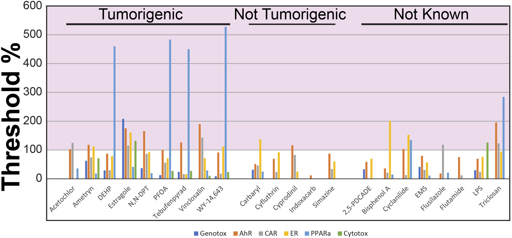 The chemicals and doses used in the study are found in Table 1 and include those that are carcinogenic and noncarcinogenic at the doses used. There were also a set of chemicals in which the carcinogenic status of the dose used is not known. The following chemicals were obtained from Bayville Chemical Supply Corporation (Deer Park, NY) at label purities >95%: acetochlor, ametryn, cyclanilide, cyfluthrin, cyprodinil, flusilazole, indoxacarb, simazine, and tebufenpyrad. The following chemicals were obtained from Sigma-Aldrich (St Louis, MO) at label purities >97%: bisphenol A, carbaryl, ethyl methanesulfonate, flutamide, lipopolysaccharide, perfluorooctanoic acid, and triclosan. WY-14,643 was obtained from A.G. Scientific (San Diego, CA) at a label purity of 98.5%, and estragol was obtained from Penta Manufacturing Company (Livingston, NJ) at a label purity of 99.7%. Lipopolysaccharide was obtained from Sigma-Aldrich Company (St. Louis, MO). Syringeability, solubility, and concentration were verified for each chemical using either HPLC or GC methodologies.