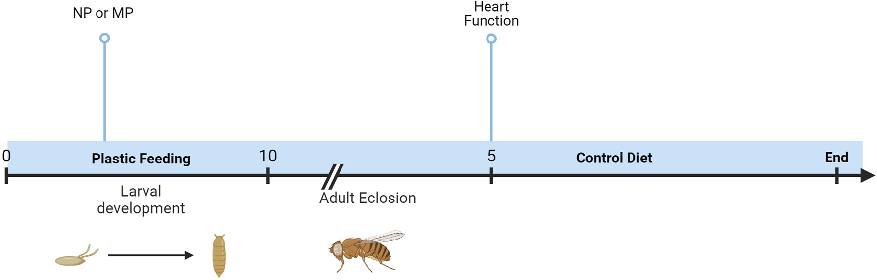 Timeline of experiments. Oral exposure to NPs or MPs was achieved via developmental feeding. Flies were removed from the diet upon eclosion, and heart function was assessed after 5 days.
