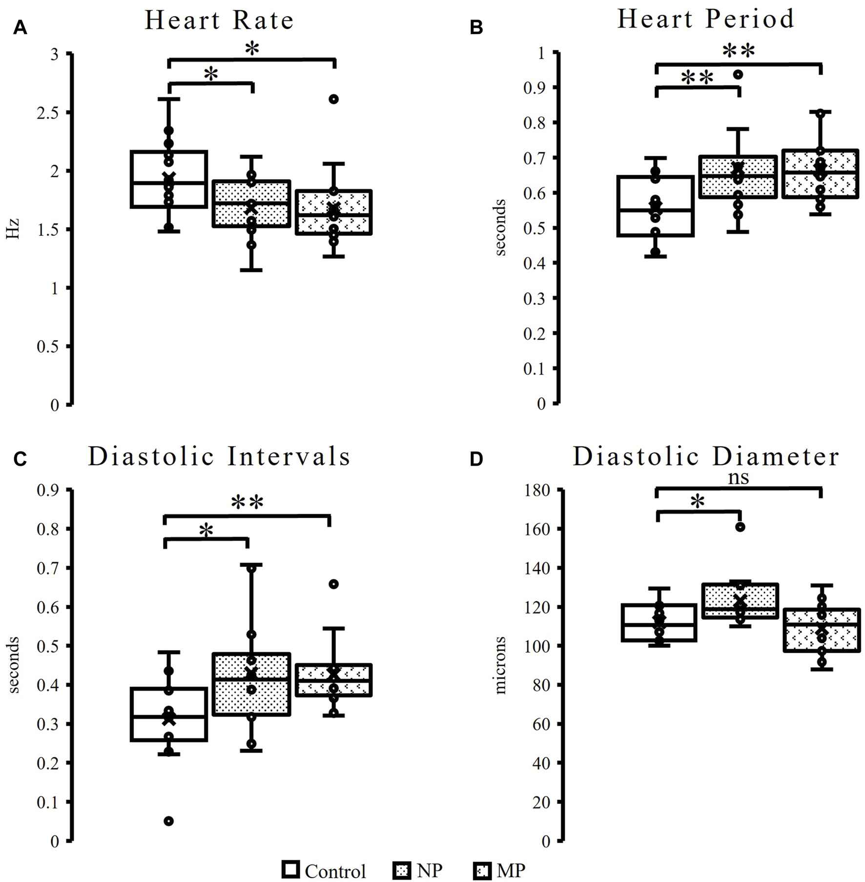Female flies with exposure to both plastic sizes experience about 13% decrease in heart rate (Figure 2A, NP p = 0.03, MP p = 0.05) with the corresponding increase in heart period (Figure 2B, NP p = 0.01, MP = 0.004). While no change is seen in male flies to heart rate or heart period (Supplementary Figures S1A, S1B), it should be noted that there is much greater variability seen in the male flies fed MPs compared to control and NPs. Female flies also demonstrate significant increases to diastolic intervals (Figure 2C, NPs p = 0.02, MPs p = 0.005) and in the diastolic diameter in flies exposed to NP (Figure 2D, p = 0.02).