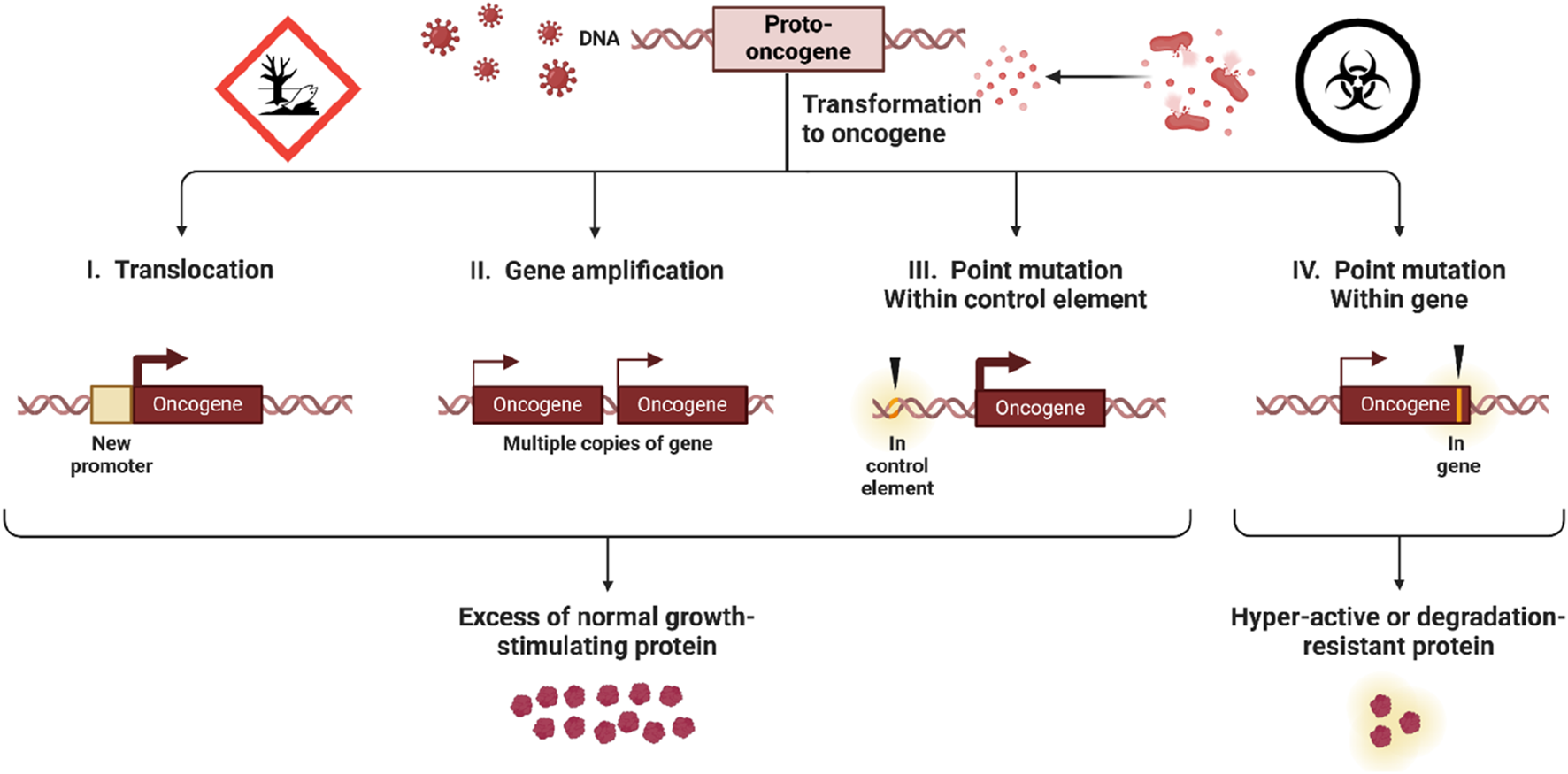 4. Activation of proto-oncogenes: Mutations in proto-oncogenes, such as ras, myc, and erbB2, can lead to their constitutive activation, converting them into oncogenes that promote uncontrolled cell proliferation and cancer (Botezatu et al., 2016).
