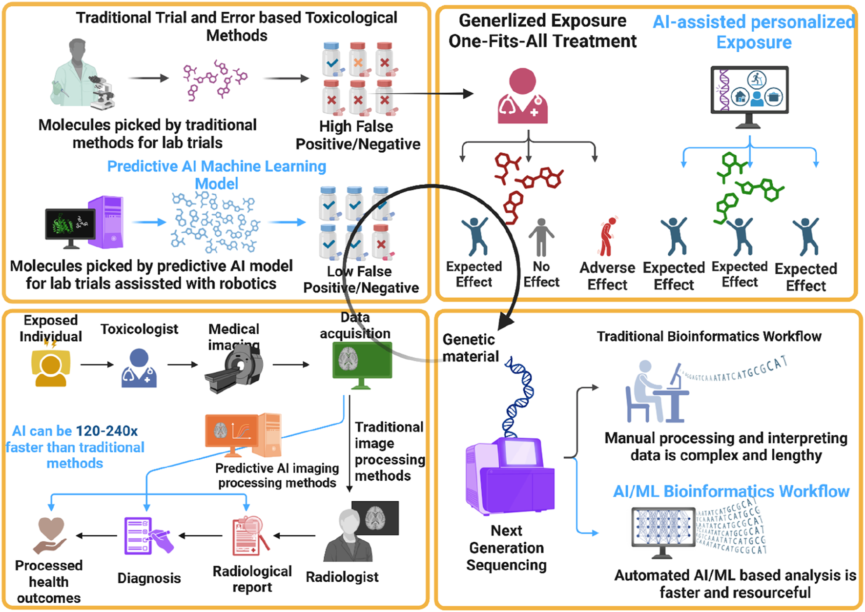 AI-ML-OMICS based Circular Toxicology Prediction Paradigm. The figure illustrates the integration of AI and machine learning (AI-ML) into the circular toxicology paradigm, showcasing significant advancements over traditional methods. It highlights how predictive AI models and robotics reduce false positives/negatives in toxicological assessments, enable personalized exposure treatments, and expedite medical imaging processing by 120–240 times. Additionally, it contrasts the manual, labor-intensive bioinformatics workflows with faster, resource-efficient AI/ML-based analyses, underscoring the transformative impact of AI-ML on improving accuracy, speed, and personalization in toxicology.