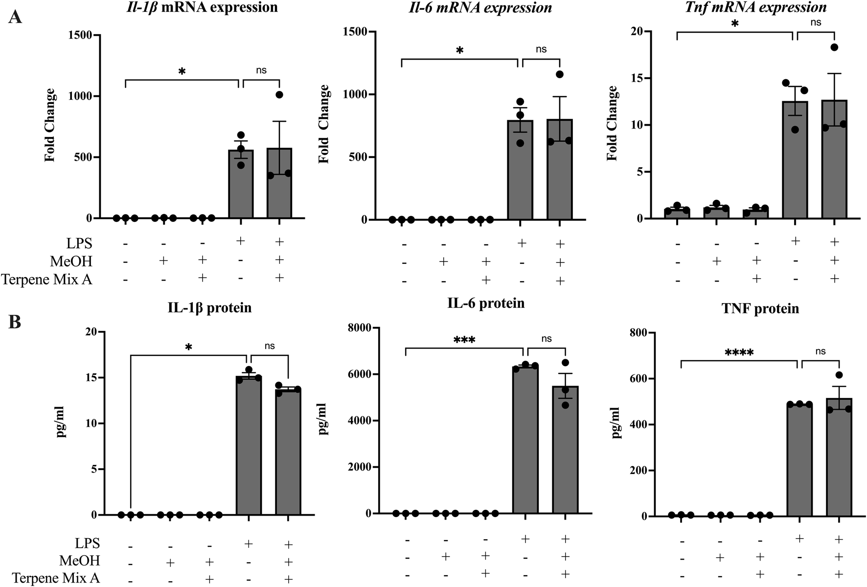 Terpene Mix A does not attenuate inflammatory cytokine production in response to LPS. MH-S cells were pretreated for 1 h with Terpene Mix A followed by the addition of LPS for 24 h before measurement of (A) mRNA and (B) protein for IL-1β, IL-6 and TNF. Results are expressed as the mean ± SEM of three independent experiments. Kruskall Wallis multiple comparisons test was applied in panel B due to a protein concentration of 0 for untreated condition; ns = not significant, *P < 0.05, ***P < 0.001, ****P < 0.0001.