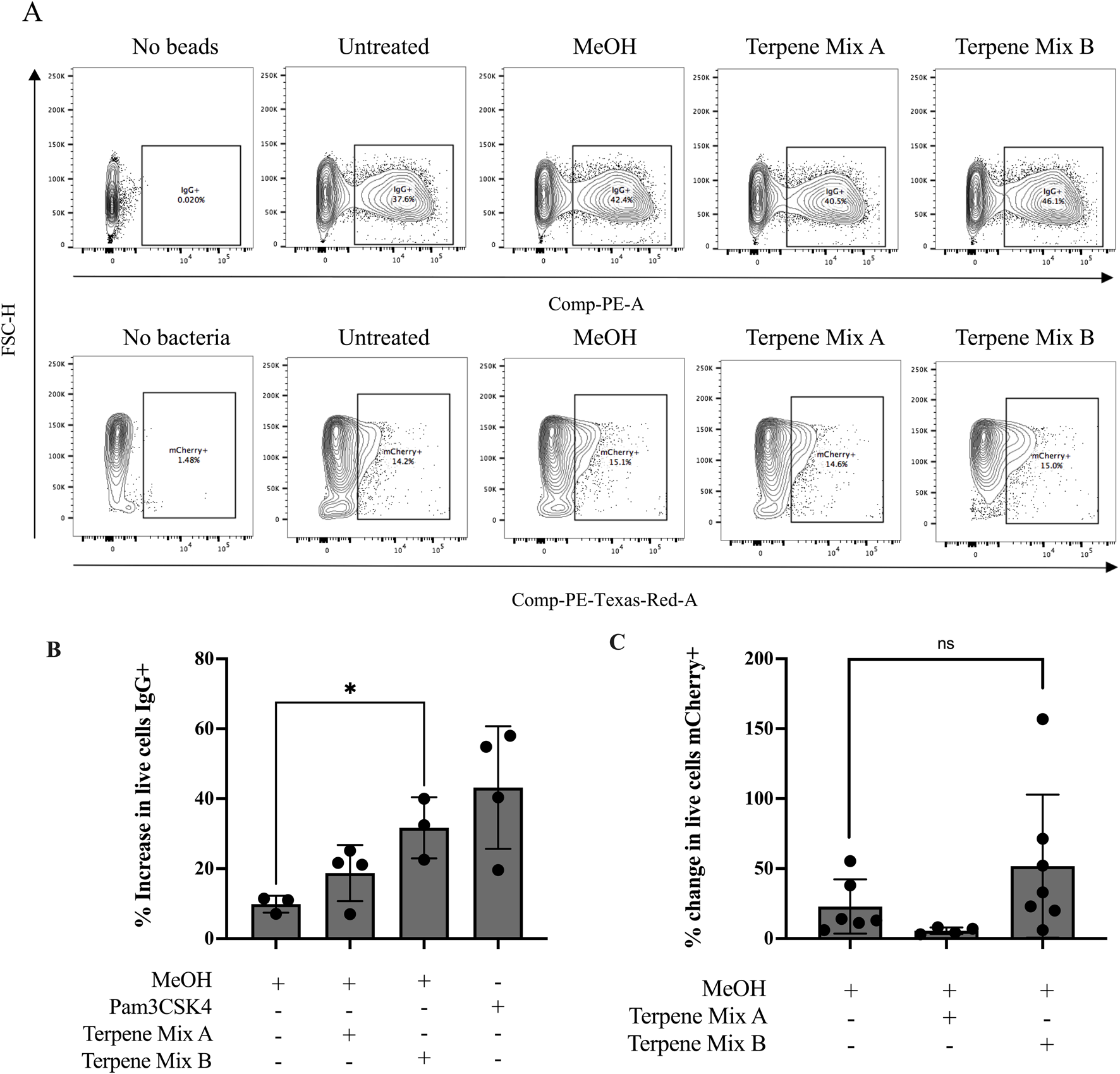 Terpene Mix B increases phagocytosis against opsonized beads. (A) Representative gating strategies for quantification of phagocytic cells using flow cytometry. (B) Terpene Mix B increased the percentage of phagocytic macrophages by approximately 30% when challenged with fluorescently labelled latex beads opsonized with IgG. (C) Neither terpene mixture significantly affected phagocytosis of mCherry-expressing Escherichia coli. Results are expressed as the mean ± SEM of 3–6 independent experiments. ns, not significant, *P < 0.05.