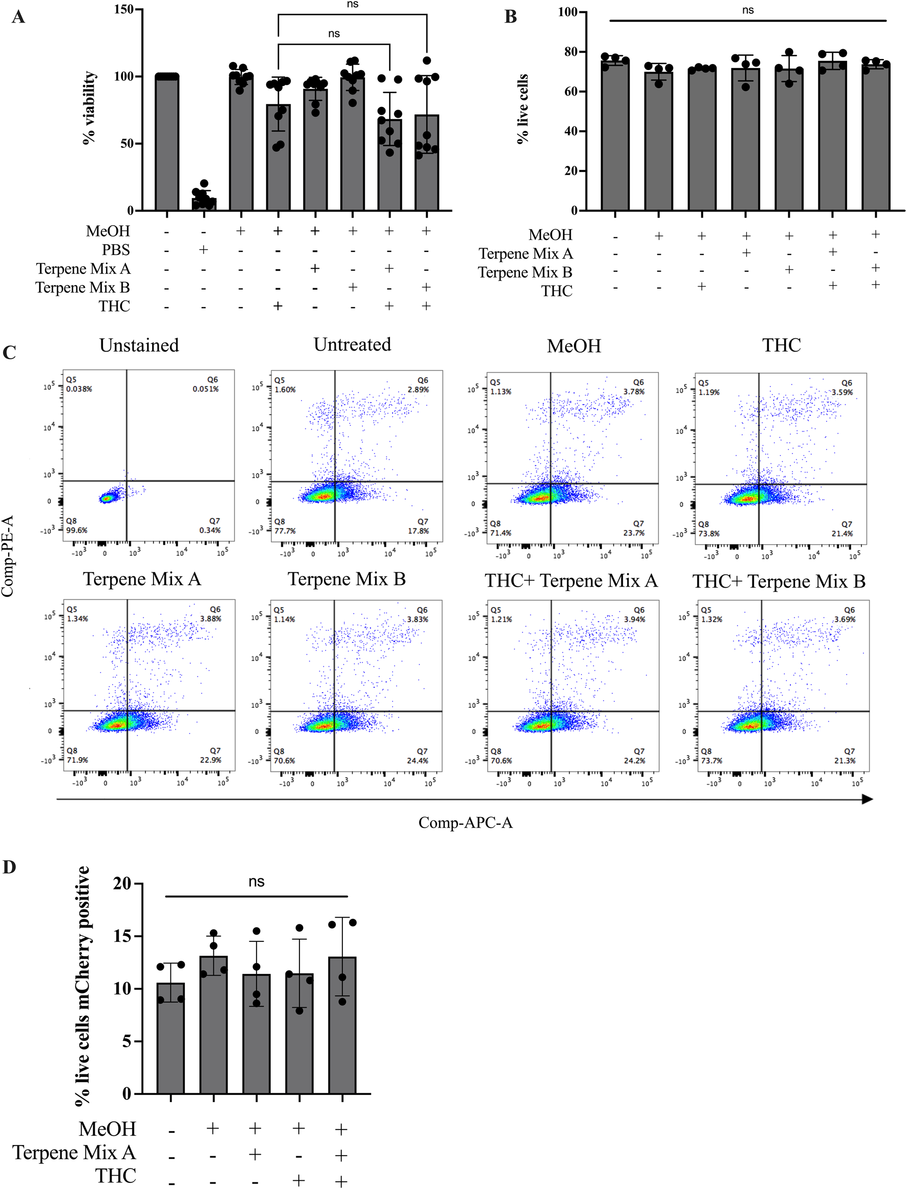 Terpenes do not potentiate the effects of Δ9-THC. Treatment of MH-S cells with terpenes in combination with Δ9-THC had no additive effect as measured by MTT assay (A) or Annexin-V PI staining assay (B). (C) Representative gating strategy for Annexin-V PI assay as measured by flow cytometry. (D) Terpene Mix A in combination with Δ9-THC did not affect phagocytosis of mCherry-expressing E. coli. Results are expressed as the mean ± SEM of 4–9 independent experiments; ns, not significant.