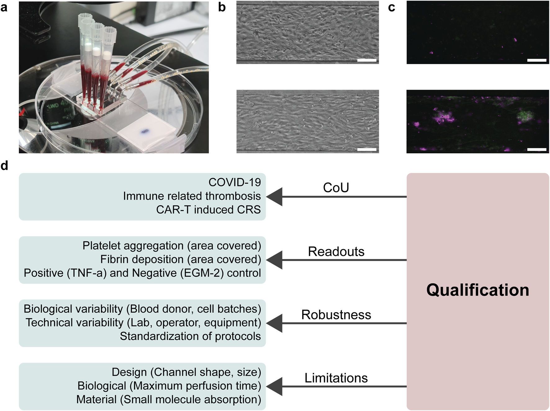 Overall, the VoC does not have a well-defined CoU as required in a framework of qualification. Naturally, the VoC has a broad, and mostly implicit, CoU in that it i) captures key aspects of microthrombosis (platelet aggregation and fibrin formation), ii) does so on activated vascular endothelium, iii) also performs in an acute (hours to days) setting. Only when collaborating with other partners did we more sharply define respective CoUs on top of the broad foundational description. For example, in studying microthrombosis as a side-effect in CAR-T immunotherapy, we defined the CoU as capturing a ‘Key Event’ of disseminated intravascular coagulation in the context of cytokine release syndrome. This ‘Key Event’ was derived from an immune-related adverse outcome pathway (irAOP), describing the causal chain of events based on scientific evidence and a consortium of experts. Similarly, when using the VoC to study microthrombosis after treatment with patient plasma, the CoU was defined as microthrombosis due to endothelial activation in response to systemic inflammation in COVID-19.