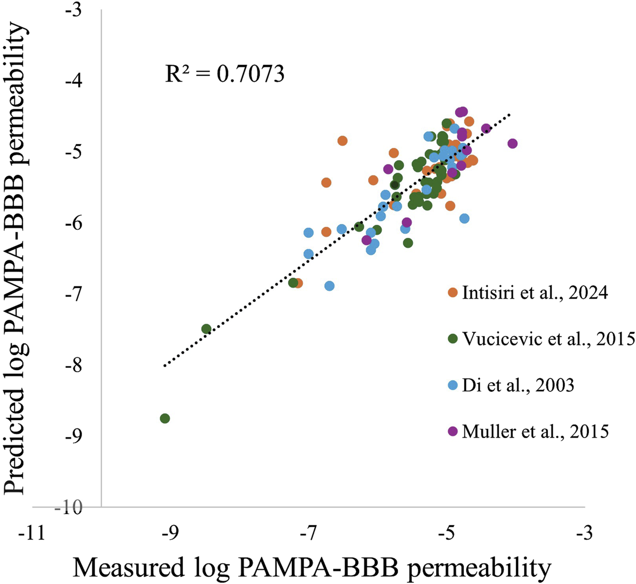 Comparison between the predicted and measured log PAMPA-BBB permeability values.