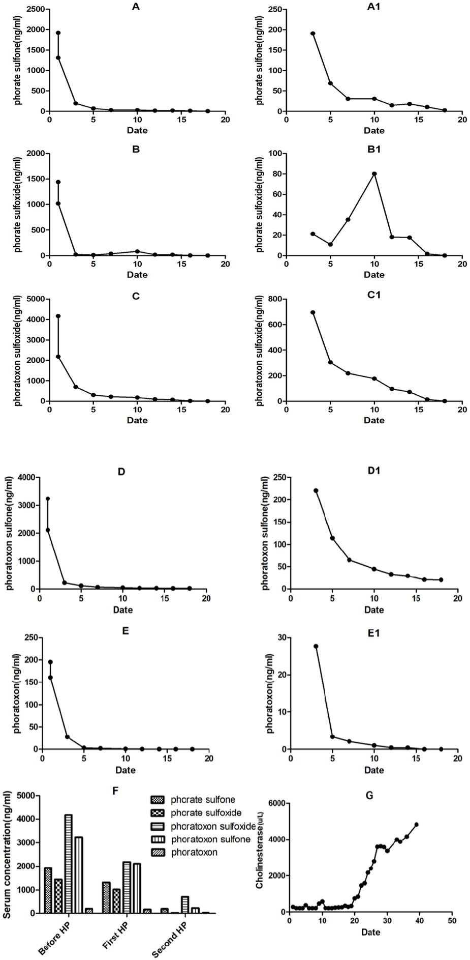 Figure 2. Changes in serum (A–F) and urine (A1–E1) levels of phorate metabolites and cholinesterase after HP treatment (G).