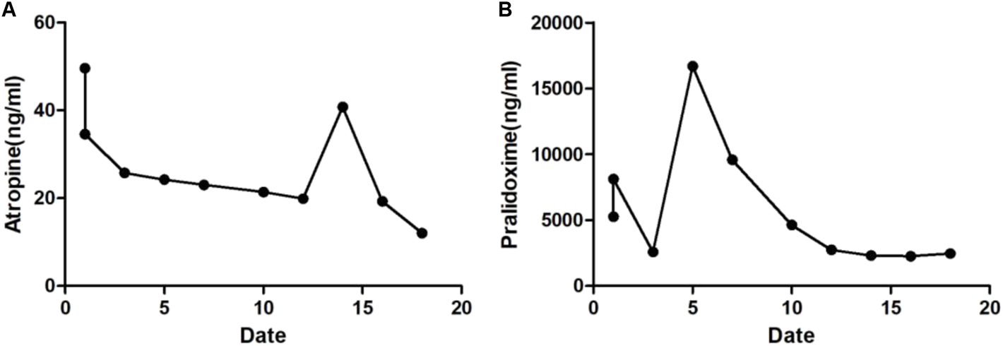 Atropine dosage for severe organophosphorus poisoning has been debated for a long time because atropine is also toxic (LD50 = 100 mg/d) (Eddleston et al., 2008; Beards et al., 1994). In the first 15 days after admission, the patient was treated with atropine at 5–10 mg/h (about 120–240 mg/D). After effective atropinization, the dosage was maintained continuously. Although large atropine doses cannot relieve the patient’s symptoms, they can speed up the heart rate, improve myocardial oxygen consumption, and cause systemic parasympathetic extreme inhibition (Thiermann et al., 2010). To ensure the lowest dose of atropine in the treatment, we monitored serum atropine levels. Previous studies and guidelines recommend using PAM for short durations (Eddleston et al., 2008; Worek et al., 1997). PAM is a cholinesterase reactivator, whose quaternary ammonium group can tend to bind to the cationic site of phosphorylated cholinesterase that has lost its activity and is bound to organic phosphorus. Its nucleophilic group can directly bind to the phosphorylated group of cholinesterase and then jointly detach from cholinesterase, restoring the original state of cholinesterase (Eddleston et al., 2004). However, because the redistribution and re-release of phorate metabolites into the blood can regenerate phosphocholinesterase, we used PAM for a long time while monitoring its serum level. Moyer et al. found that the aging of AChE inhibited by phorate was very slow, and no significant aging was observed within 48 h. The therapeutic window for oxime administration following exposure to phorate is not limited by aging. Therefore, we used PAM for a total of 15 days (Moyer et al., 2018b). Bloch-Shilderman et al. describes exactly this phenomenon of slow release of the agent (from a dermal depot) to blood circulation, thus continuously inhibiting new de novo synthetized ACHE (Bloch-Shilderman et al., 2023).