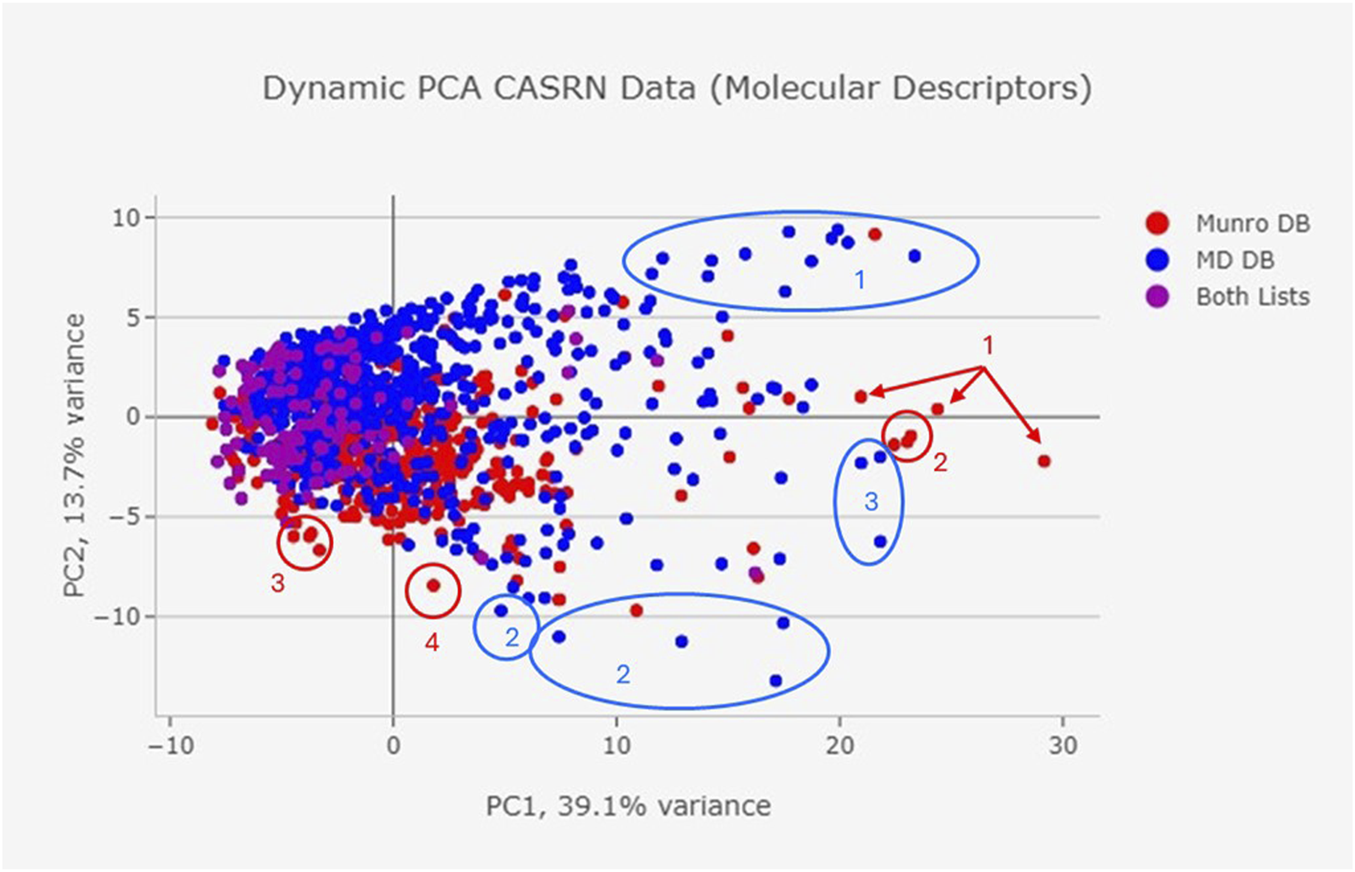 The National Toxicology Program’s (NTP’s) Integrated Chemical Environment (ICE) software (v. 4.0.2) (RRID:SCR_002616) (NTP ICE, 2024), Chemical Characterization Dynamic Principal Component Analysis (PCA) was used to visualize chemical characteristics, based on a set of molecular descriptors that are mathematical representations of chemical structures (e.g., XLogP, MW, LipinskiFailures, nRotB, topoShape, nAromBond, nAcid, nHeavyAtom, nBonds, etc.). Data points that are close together on a dynamic PCA plot have similar molecular descriptors and, therefore, similar chemical structures/structural characteristics. CAS Nos. were utilized as the chemical identifiers in ICE.
