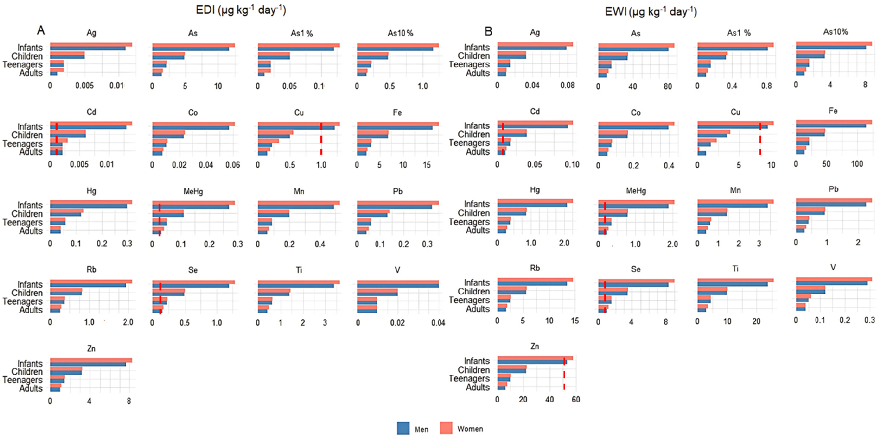 | Estimated Weekly Intake (EWI) (µg kg−1 week−1) | EWI = EDI × 7 | The EDI is calculated as the estimated daily intake multiplied by 7. | • Infants: Cd < 0.0058 mg kg−1 day−1 bw; Cu < 7 mg kg−1 day−1 bw; MeHg < 0.0112 mg kg−1 day−1 bw; Se < 0.42 mg kg−1 day−1 bw; and Zn < 49 mg kg−1 day−1 bw. • Children: Cd < 0.0058 mg kg−1 day−1 bw; Cu < 21 mg kg−1 day−1 bw; MeHg < 0.0112 mg kg−1 day−1 bw; Se < 0.91 mg kg−1 day−1 bw; and Zn < 91 mg kg−1 day−1 bw • Teenagers: Cd < 0.0058 mg kg−1 day−1 bw; Cu < 28 mg kg−1 day−1 bw; MeHg < 0.0112 mg kg−1 day−1 bw; Se < 1.75 mg kg−1 day−1 bw; and Zn < 154 mg kg−1 day−1 bw • Adults: Cd < 0.0058 mg kg−1 day−1 bw; Cu < 35 mg kg−1 day−1 bw; MeHg < 0.0112 mg kg−1 day−1 bw; Se < 2.1 mg kg−1 day−1 bw; and Zn < 175 mg kg−1 day−1 bw. |